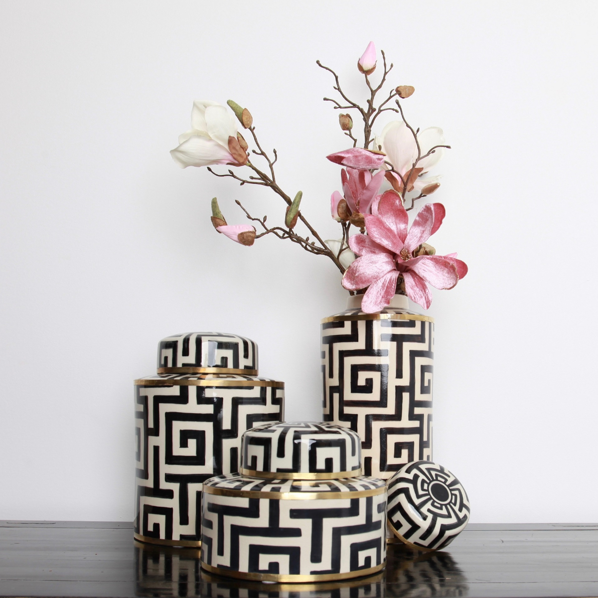 Die Keramikvasen von Osten Interieur bedienen sich jener klassischen Designs, aber auch die modernen Dekore sind super schicke Hingucker. Dieses moderne Muster etwa, das etwas an ein Labyrinth erinnert, hat es uns insbesondere im Kontrast zur bauchigen Vase sehr angetan. Die hochwertige Metalleinfassung in Gold verleiht der Deckelvase ein hochwertiges und luxuriöses Finish. Sie ist, wie alle Keramiken von Osten Interieur, handbemalt und mehrfach gebrannt und daher besonders langlebig.