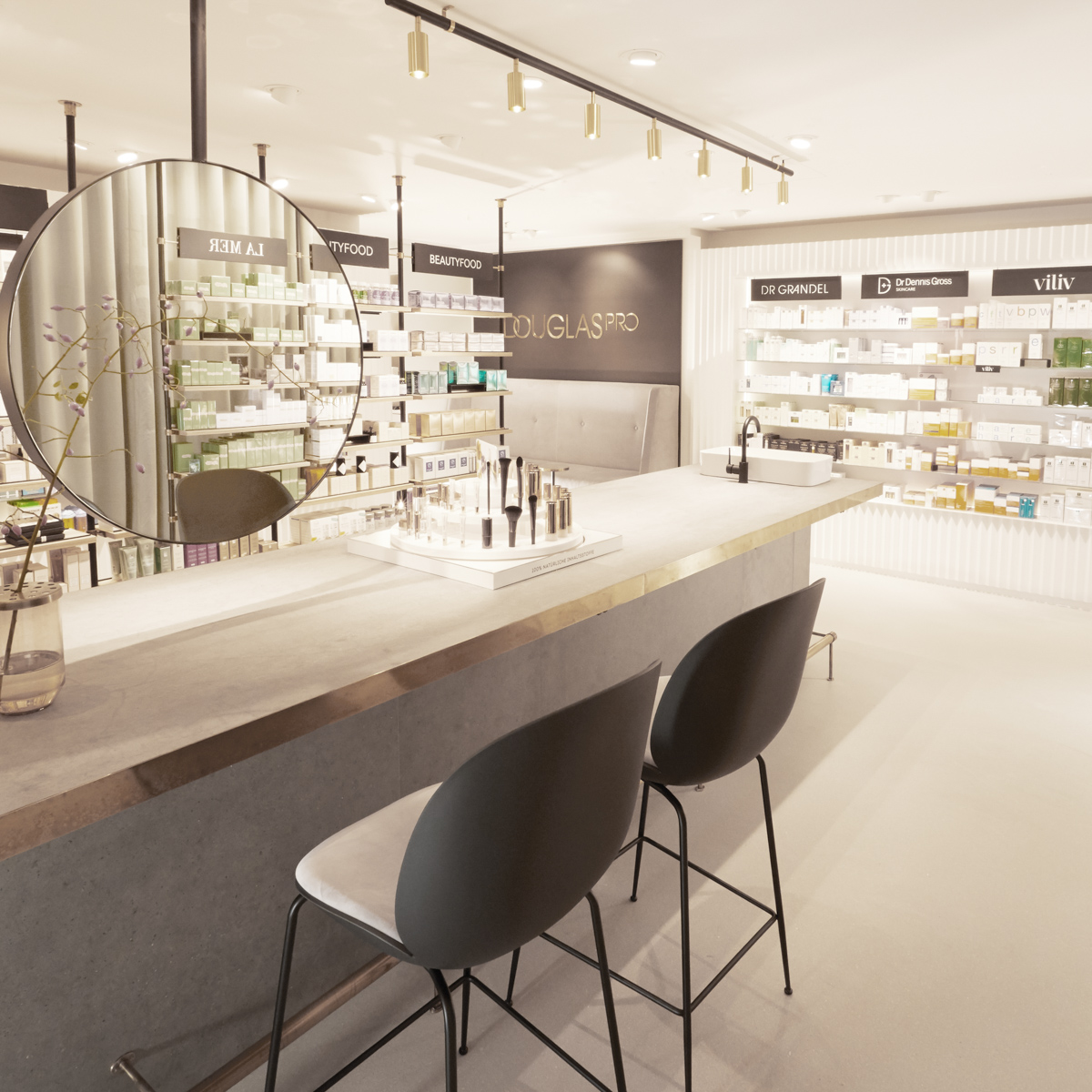 Mit Hilfe des Hautanalyse-Projekts "Skinmade" kann hier sogar live vor Ort eine personalisierte Gesichtscreme hergestellt werden. Im Übrigen werden erstklassige Treatments von wechselnden Beauty Labels angeboten. Zuletzt war beispielsweise Susanne Kaufmann mit ihren luxuriösen Naturkosmetik-Produkten und eigenen Kosmetikerinnen für 14 Tage zu Gast. Ganz unabhängig davon präsentiert sich das Pro Store Konzept in einem wunderschönen neuen Look, der die zukünftige Ausrichtung von Douglas auch auf der Straße sichtbar macht.