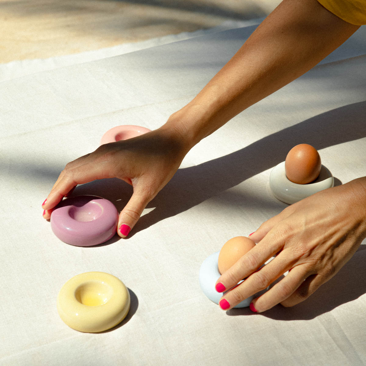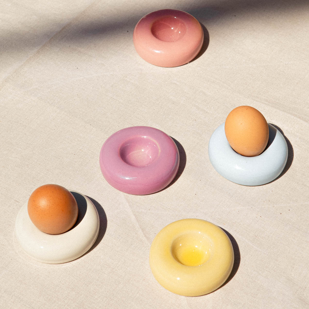 Die simplen und formschönen Eierbecher des Keramiklabels Motel a Mio legen sich wie kleine Rettungsringe um das Ei und verbreiten zuverlässig gute Laune – auf dem Frühstückstisch und erst recht auf jeder Ostertafel. Es gibt sie in fünf frischen Pastelltönen und sie geben sowohl weißen als auch braunen Eiern einen farbenfrohen Rahmen. Da muss der Osterhase die Eier nicht einmal mehr in Farbe tauchen.