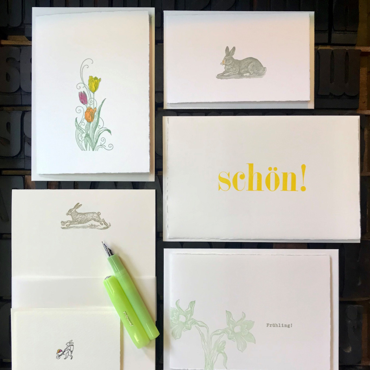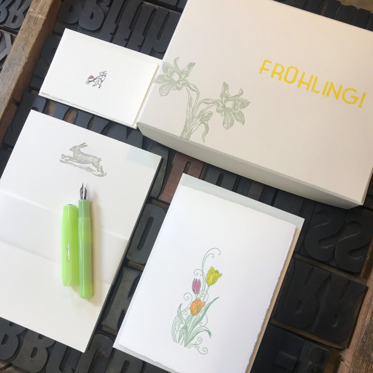Alle Karten im Set kommen mit einem passenden Kuvert. Damit Sie sich in ihren Frühlingsgrüßen nicht limitieren lassen müssen, umfasst das exklusive Oster-Set zudem einen handbedruckten Schreibblock mit 50 Blatt sowie einen frühlingsgrünen KaWeCo-Füller und passende Tintenpatronen. Die Marke KaWeCo stellt bereits seit 1883 hochwertige Füllfederhalter und andere Schreibutensilien her.