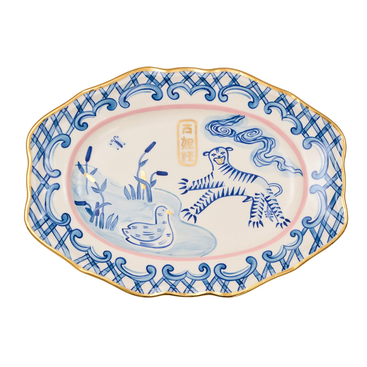 Die Kollektion umfasst fünf Stücke, darunter eine Servierplatte – unser Favorit! – Teller, eine Butterdose und ein Deckeltöpfchen. Alles handgefertigt und handbemalt. Jedes Exemplar ziert transliteriert der Name „Gunia“ in chinesischen, japanischen oder thailändischen Zeichen. Zudem ist das wiederholt verwendete Motiv eines Tigers ein kraftvolles Symbol für Schutz, Stärke und innere Harmonie.