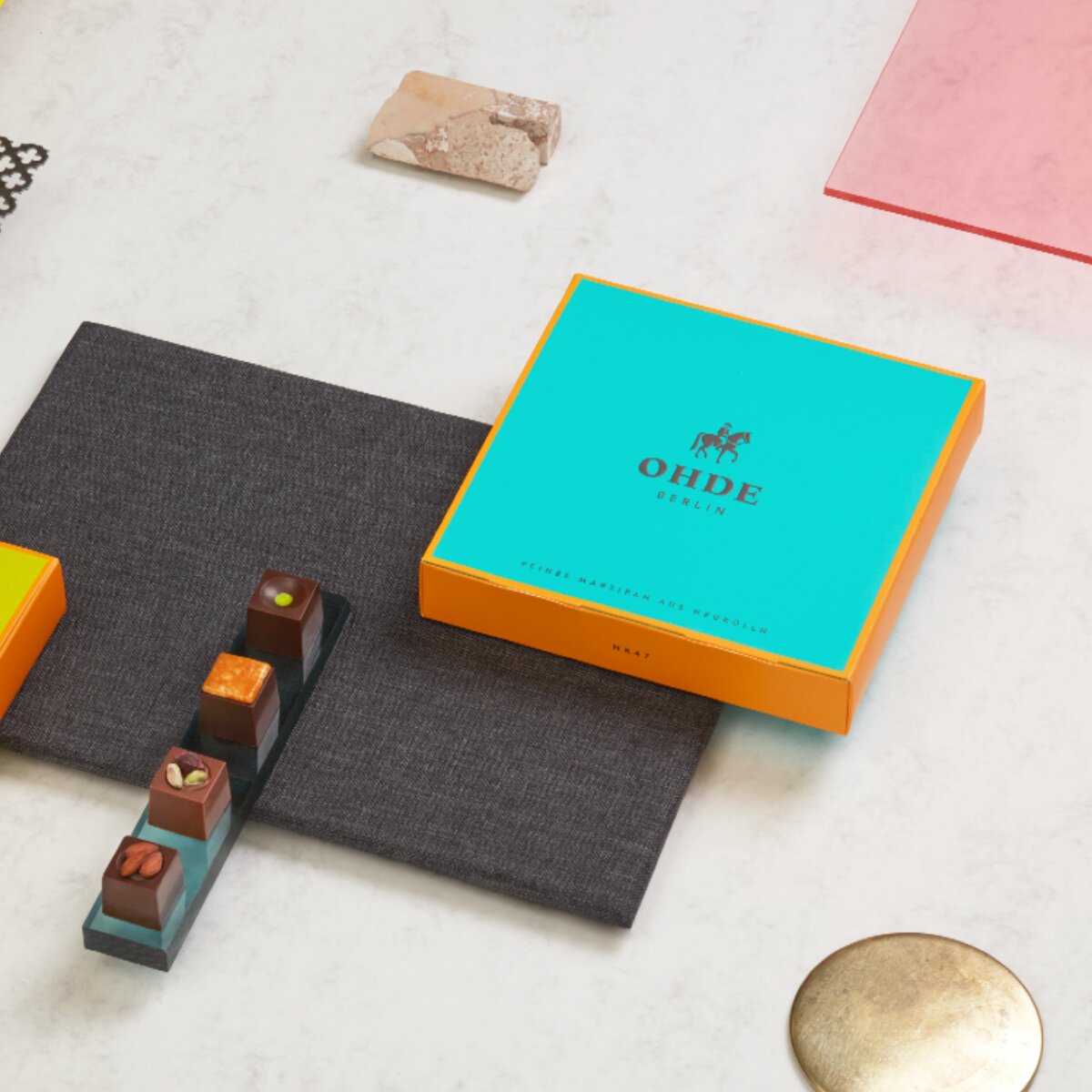 Wenngleich sich bereits der Geschmackssinn an den feinen Marzipan Pralinen von Ohde Berlin erfreut, ist auch die Verpackung ein echter Hingucker. Wie heißt es so schön? Genau: Das Auge isst mit: schlicht-edles Design, eine königliche Reiterstatue sowie das strahlende Türkis, das etwas an begehrte Schmuckboxen erinnern mag.