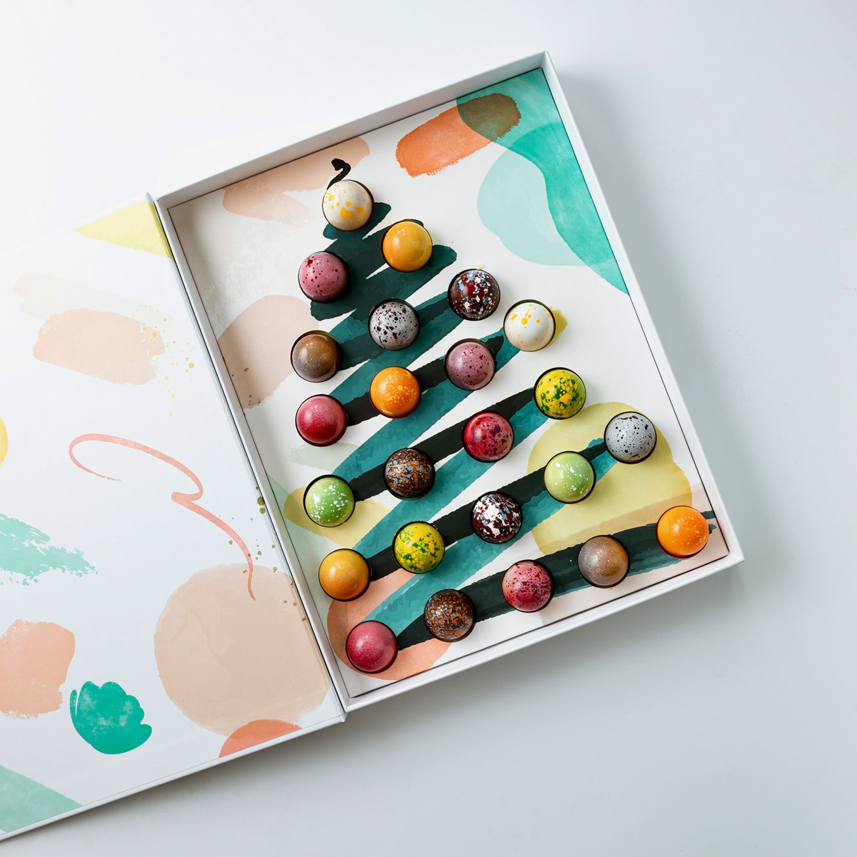2020 begann alles mit einem Adventskalender, den Marie Mang seither erfolgreich und in jedem Jahr neu bestückt produziert. 2023 gibt es folglich Kalender Nr. vier – A Christmas Tree, der mit seinem Design erneut ein echter Hingucker ist. So bringt die Pralinen Manufaktur Muya Sweets aus Berlin Mitte so richtig Farbe in die graue Winterzeit.