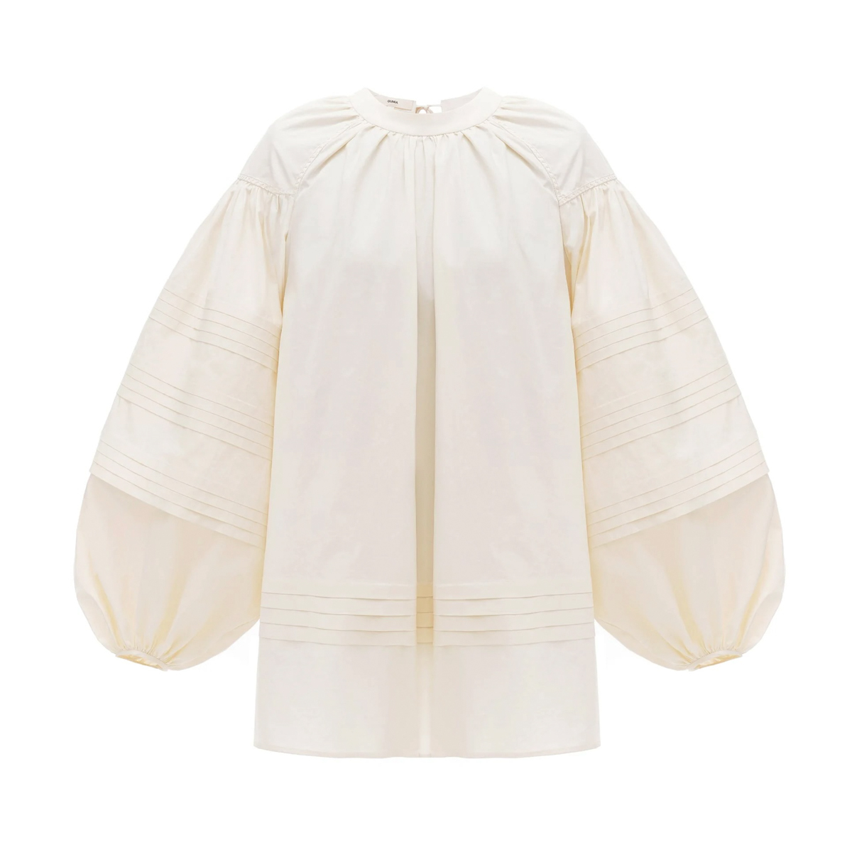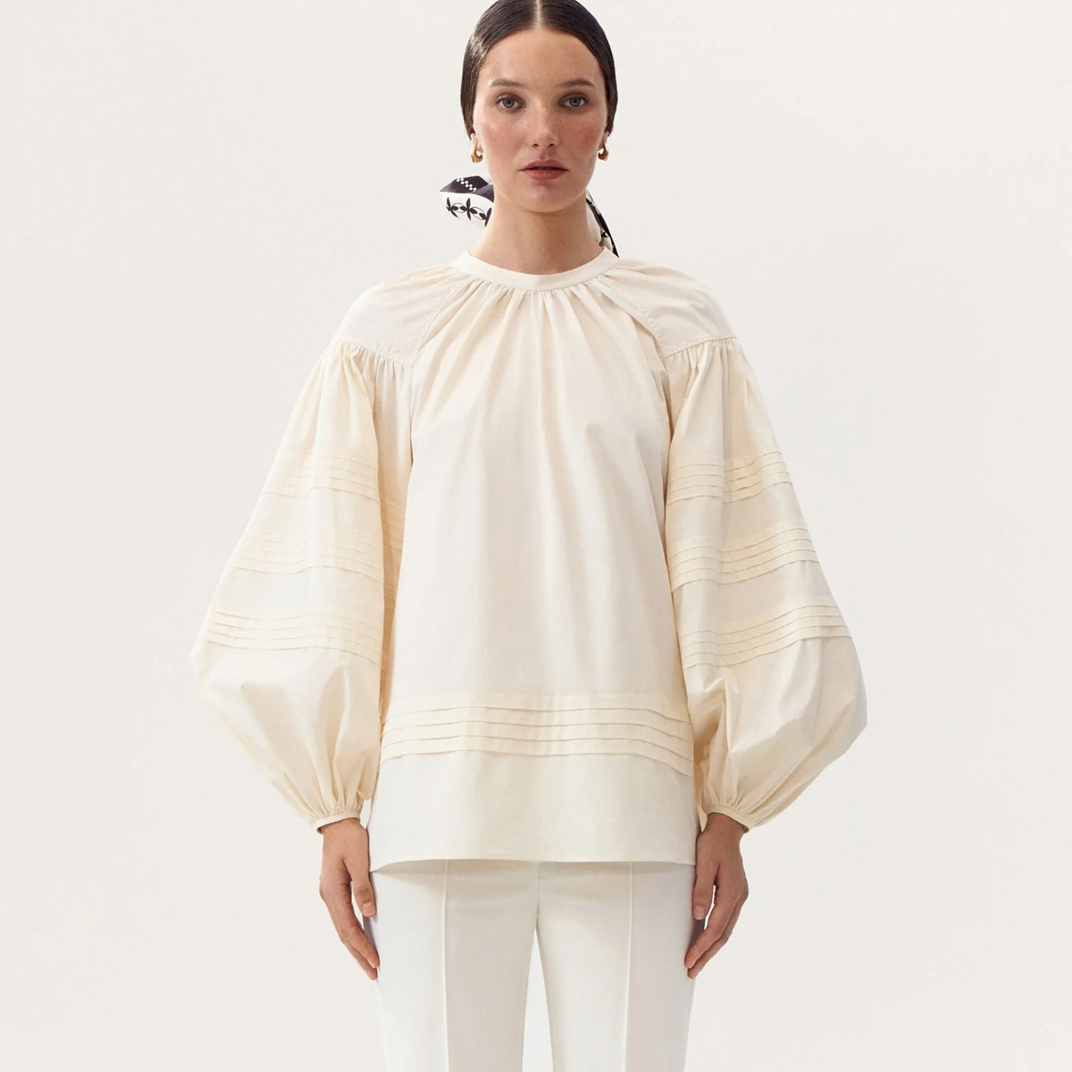 Das „Oriiana Embroidered Shirt“ ist ein Beispiel dafür, wie das ukrainische Label Gunia Tradition und Moderne miteinander verbindet. Die Bluse aus reiner Baumwolle ist schlicht und zugleich detailreich: weite Ärmel, Bänder zum Zubinden am Rücken und monochrome Falten-Details. Diese Form des Drapierens gehört seit Jahrhunderten zur ukrainischen Textilkultur und wird hier behutsam neu interpretiert.