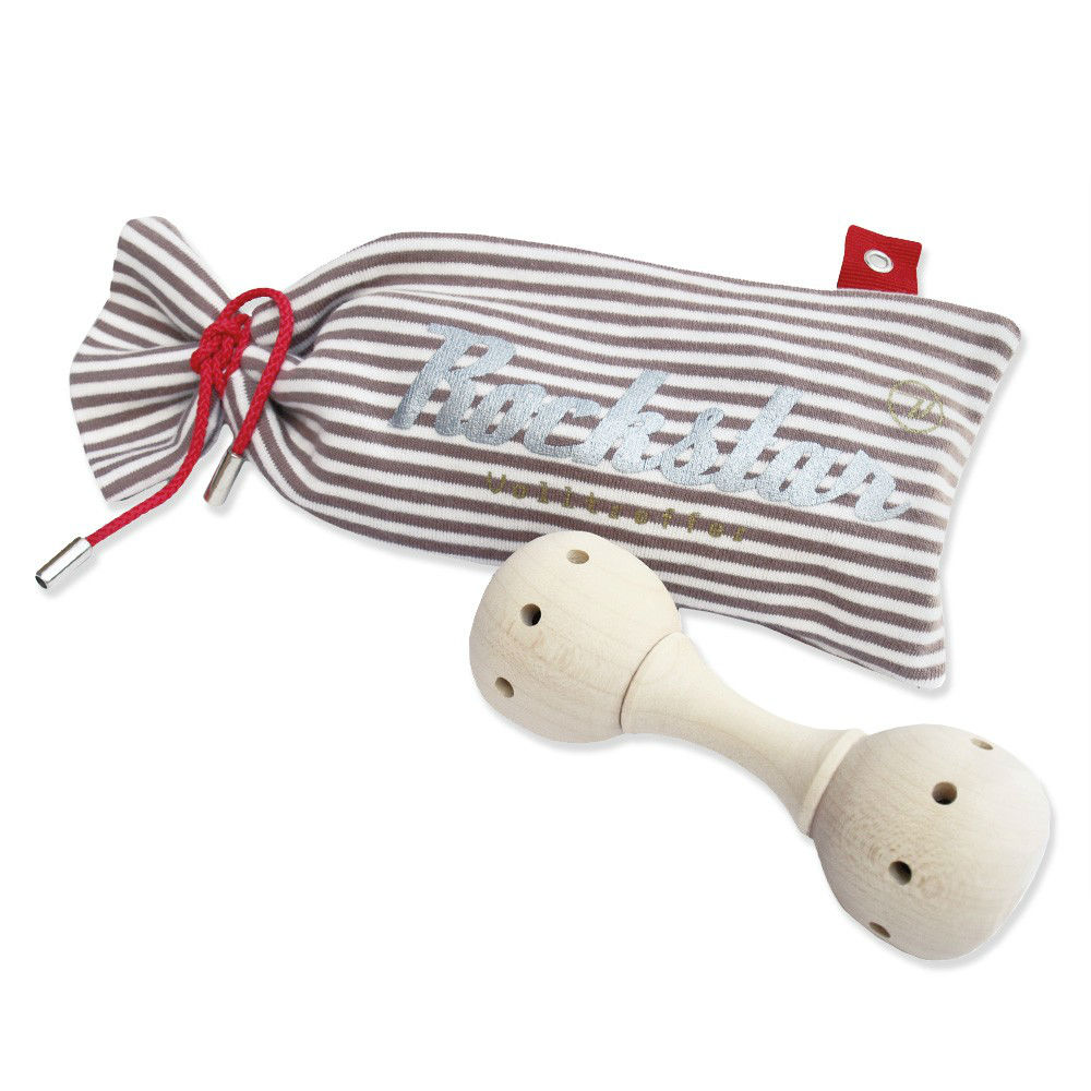 Diese handgearbeitete Babyrassel aus naturbelassenem Ahorn hat einen zauberhaft zarten Klang und wird von Hand in einer kleinen Manufaktur in Österreich gefertigt. Außergewöhnlich verpackt im geringelten Baumwollbeutel mit 'Rockstar' Print wird sie zum hitverdächtigen Geschenkset zu Geburt und Taufe. Exklusiv von Volltreffer!