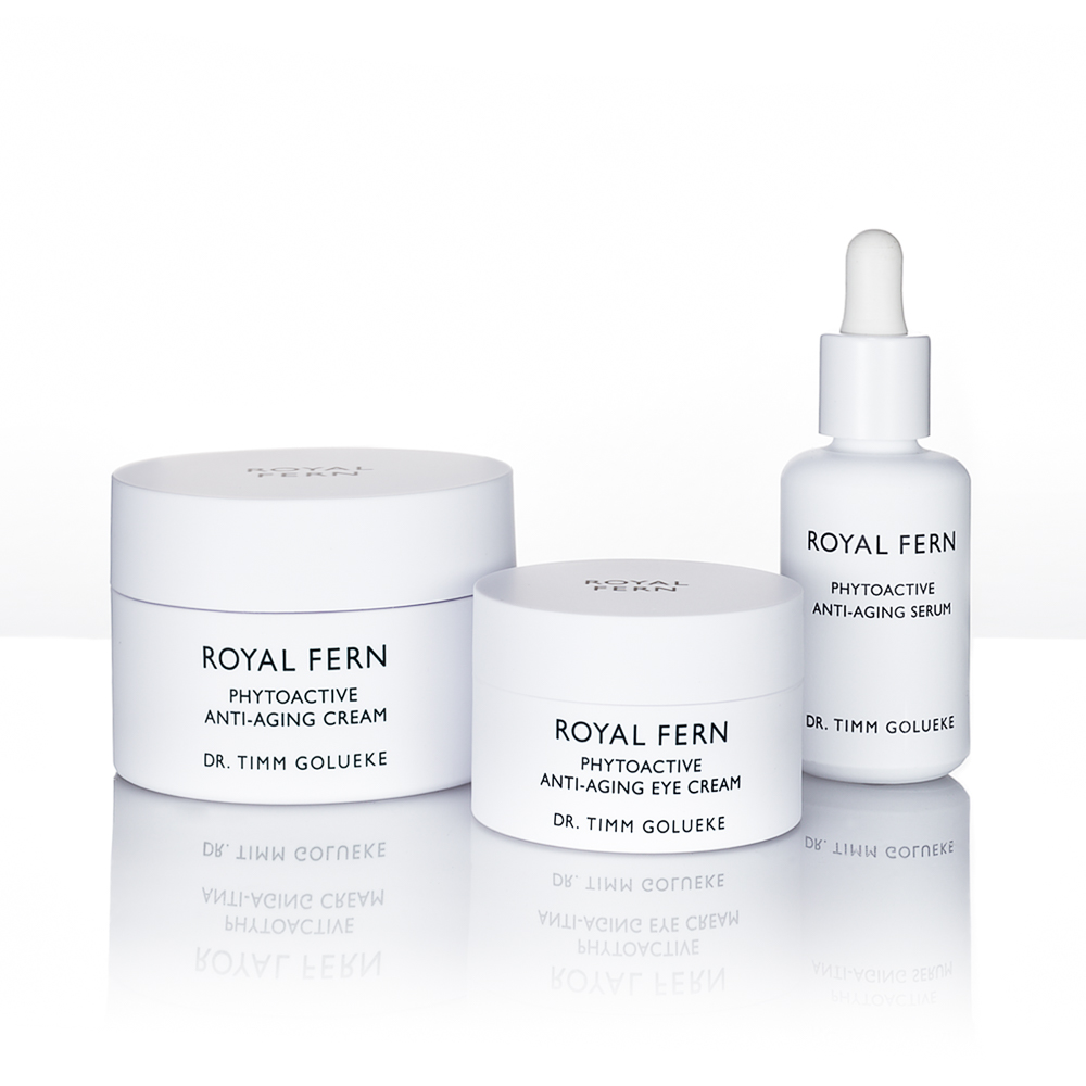 Jahre lang hatte Dr. Timm Golueke, einer der renommiertesten Dermatologen Deutschlands und ein international gefragter Anti-Aging-Experte, gemeinsam mit einem Team weiterer Koryphäen an der Rezeptur für seine Vision von einer Pflege, die strafft, festigt und lang anhaltend Feuchtigkeit spendet, getüftelt. Über die Fachstudie eines New Yorker Krebs-Krankenhauses zu der Wirksamkeiten von Farnextrakten war er auf die zahllosen positiven Eigenschaften der über 400 Millionen Jahre alten Farne aufmerksam geworden und bei seinen folgenden Recherchen auf weitere Studien gestoßen, die das breit gefächerte Anti-Aging-Potenzial, besonders im Hinblick auf lichtbedingte Hautschädigung beschreiben.