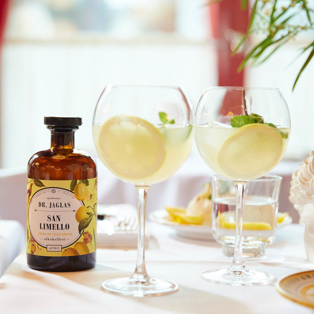 Nur ein paar Wochen ist es her, dass wir im neu eröffneten Restaurant Matthias in Prenzlauer Berg diese herrliche alkoholfreie Alternative zu einem italienischen Limoncello als Aperitif entdeckt haben. Dort wurde der „San Limello“ von Dr. Jaglas als „Limello Spritz“ mit herbem Tonic und etwas Minze serviert und stand einem klassischen Spritz in nichts nach.