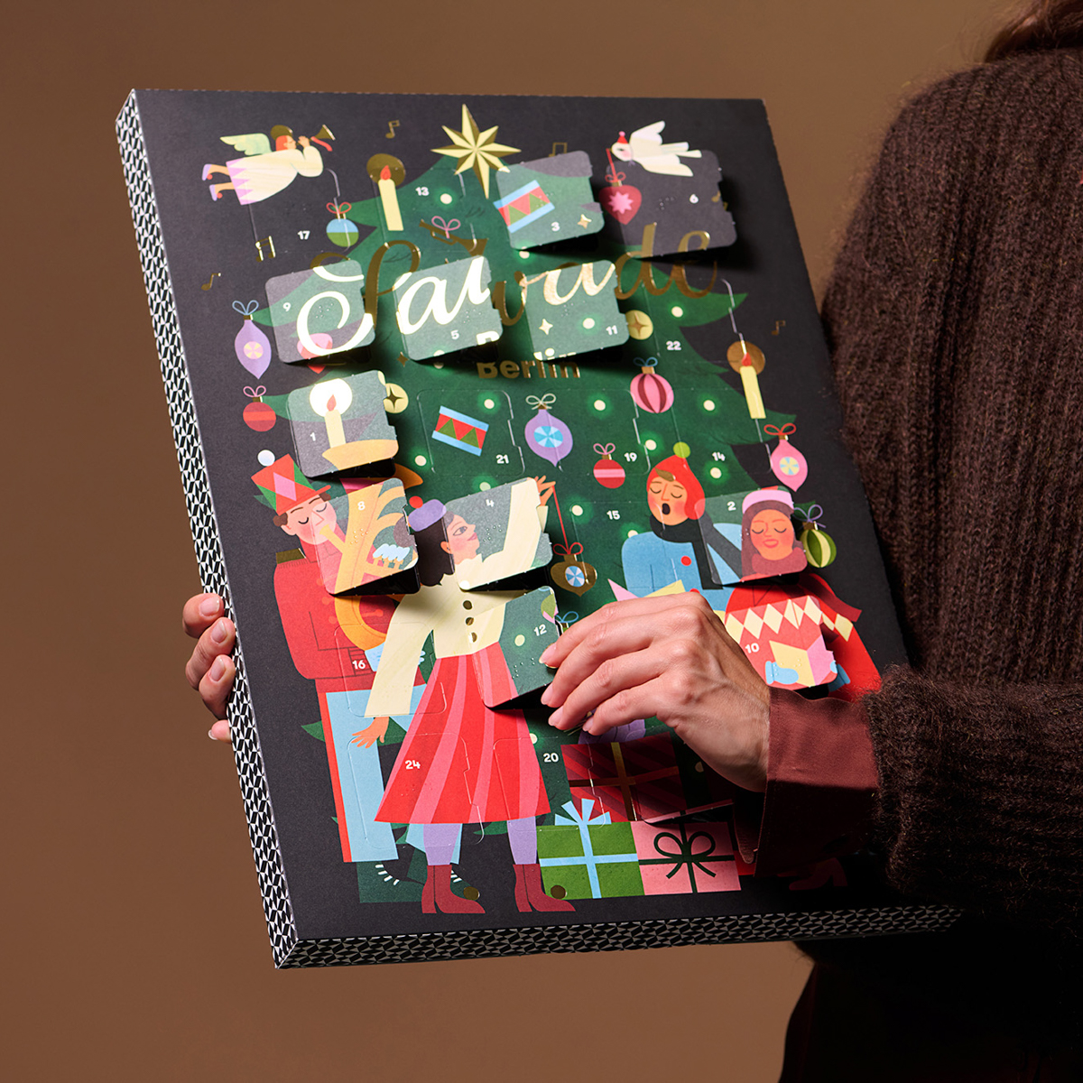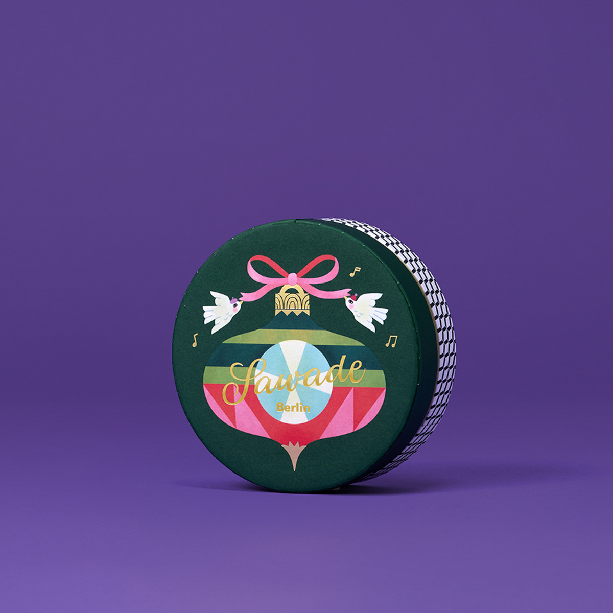 Tanzende Tiere, Trommler, Ornamente – auf den neuen Dosen und Schachteln begegnet man einer Welt, die irgendwo zwischen Fantasie und Erinnerung liegt. Mal verspielt, mal reduziert, aber immer mit der gewissen Eleganz, die zu Sawade passt. Besonders schön: Der diesjährige Adventskalender, gestaltet mit einem leuchtenden Tannenbaum vor winterlicher Kulisse. Wie in den Vorjahren ist er mit Braille-Schrift versehen – ein inklusives Detail, das selten ist und umso mehr berührt.