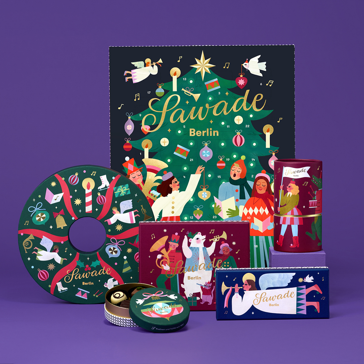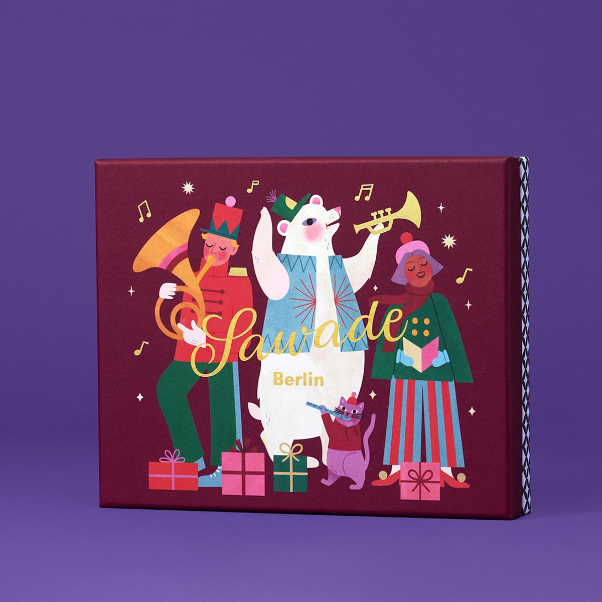 Die Berliner Pralinenmanufaktur Sawade verbindet seit jeher feine Confiseriekunst mit einer klaren gestalterischen Handschrift. Für die diesjährige Weihnachtsedition kommt frischer Wind aus England: Die Illustratorin Clare Owen hat die Verpackungen entworfen – farbenfroh, detailreich und jung. Inspiriert von skandinavischem Design und mid-century Illustrationen erzählt ihr Stil von Weihnachtsfesten, wie man sie sich gern vorstellt: warm, liebevoll und voller kleiner Rituale.