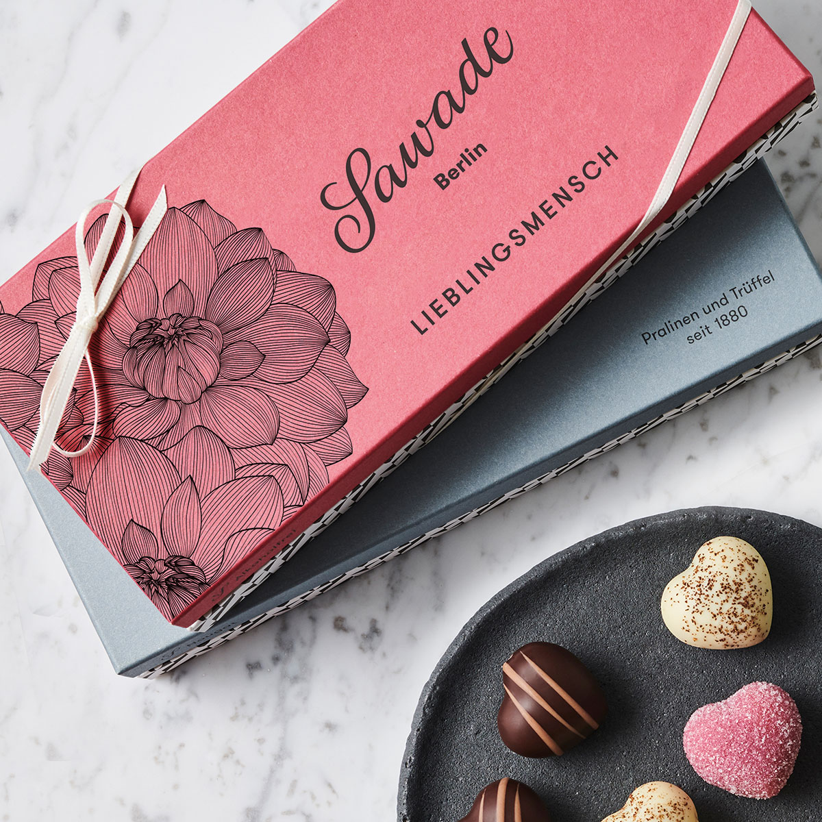 Jene gibt es in fünf verschiedenen Sorten, schließlich ist jeder unserer Lieblingsmenschen ganz unterschiedlich. Und Sie wissen natürlich am Besten, ob es lieber Nougat, Trüffel, Bitterschokolade oder Alkoholfrei sein soll – oder ganz pragmatisch eine Schachtel voll gemischter Sawade-Köstlichkeiten. Jede Geschenk-Box ist gefüllt mit 10 Pralinen des Berliner Traditionsgeschäfts.