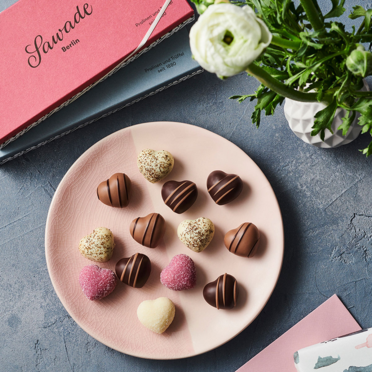 Bis heute werden feinstes Konfekt, Pralinen, Trüffel und Schokoladenspezialitäten aus besten Zutaten und nach feinen Rezepturen von Hand in Berlin gefertigt – zauberhaft umhüllt verzücken und die Konfiserie-Spezialitäten jedes Mal aufs Neue. Neben den hinreißenden Lieblingsmensch-Pralinenschachteln bietet Sawade auch andere schöne Aufmerksamkeiten zum Muttertag an. Wie wäre es etwa mit süßen Trüffelherzen, ein paar knallig-knisternden Brausetrüffeln oder weiteren herrlichen Pralinenschachteln.