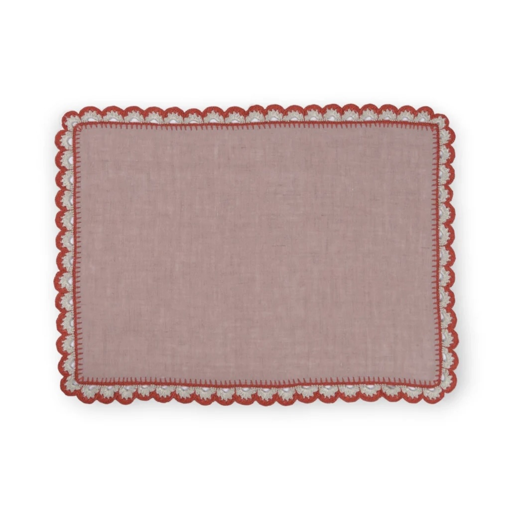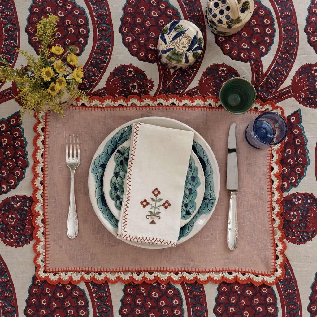 Jede Stickerei entsteht in liebevoller Handarbeit im Malaika Embroidery Training Centre in Kairo – einer Initiative, die Frauen die Möglichkeit bietet, traditionelle Handwerkstechniken zu erlernen und eigenständig zu arbeiten. Die leuchtenden Stickfarben – von Amber über Coral bis hin zu einem tiefen Blau – verleihen der Serviette eine lebendige Note und harmonieren wunderschön mit den zarten Tönen der „Scallop Placemat“.