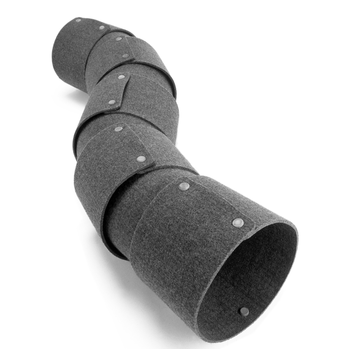 Auch zum Versteckspiel eignet sich die Fuchsbau-ähnliche Filzröhre hervorragend. Durch Holzknöpfe sind die verschiedenen Teile gelenkartig miteinander verbunden. Die Beweglichkeit der einzelnen Gelenke erlaubt somit auch ein beherztes Eingreifen „während der Jagd“ – sollten die „fünf Minuten“ einmal ausarten. Die Filzstärke von 6 mm macht Snakerun robust und widerstandsfähig – und ist dazu noch leicht zu reinigen und waschbar bei 40° Grad.