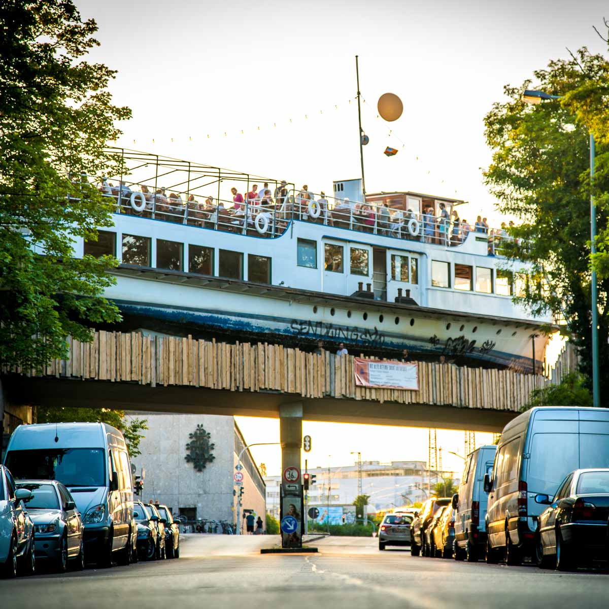 Der Ausflugsdampfer MS Utting beförderte 65 Jahre lang Unmengen an Passagieren über den Ammersee. Jetzt steht das historische Traditionsschiff, umbenannt in Alte Utting, in der Stadt an Land – und zwar auf einer stillgelegten Eisenbahnbrücke in der Lagerhausstraße in Sendling.