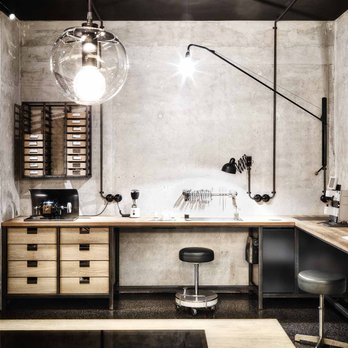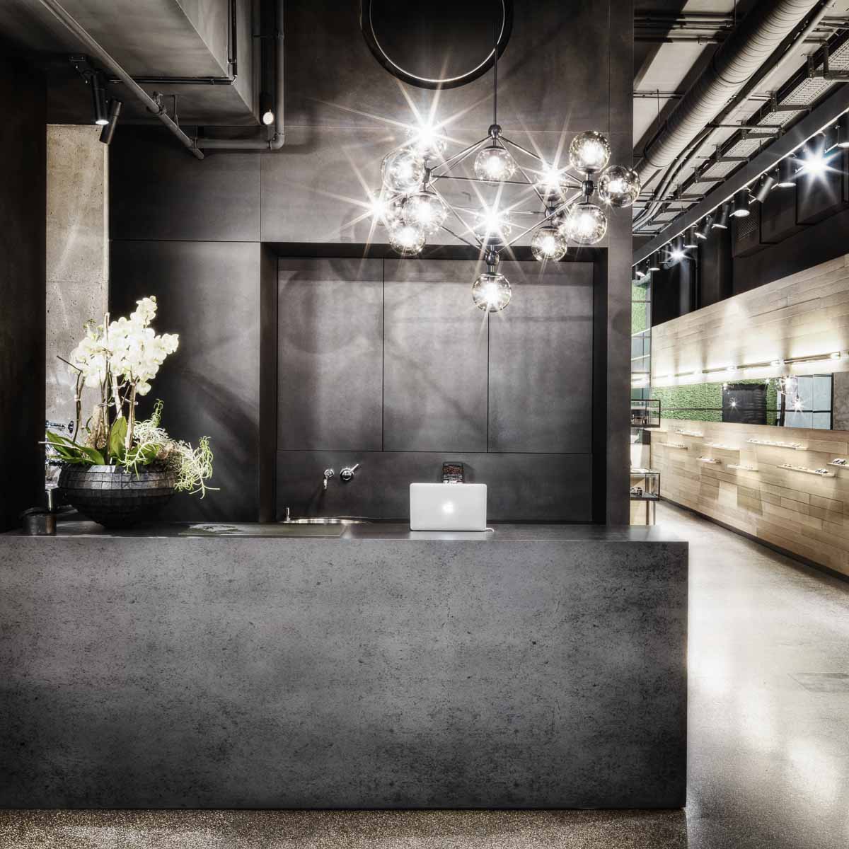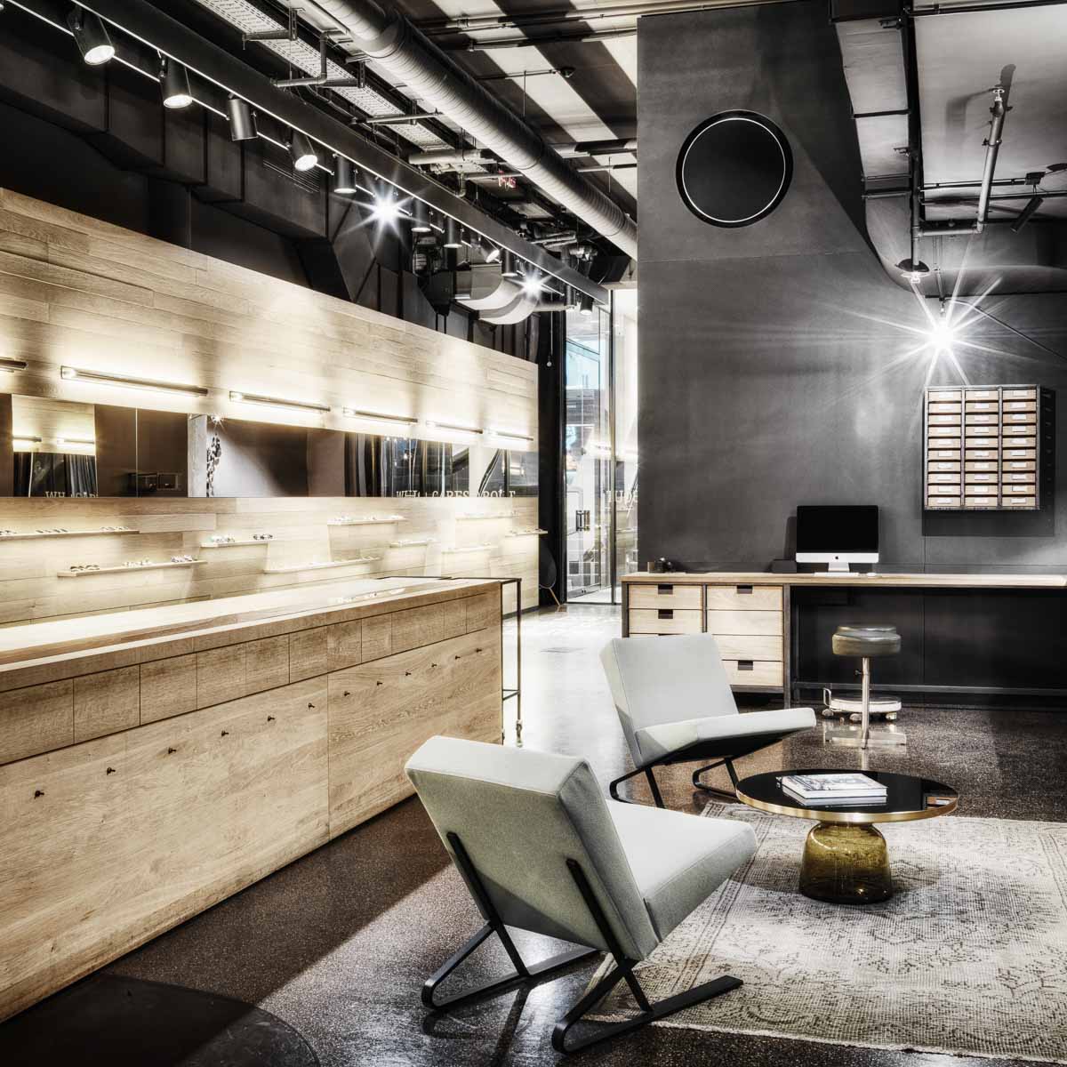 Das Interieur des Stores ist ebenfalls außergewöhnlich. Es wurde von der Münchner Innenarchitektin Stephanie Thatenhorst in enger Zusammenarbeit mit Inhaber Christian Leidmann entworfen. Unbehandeltes Eichenholz, geölter Schwarzstahl, Sichtbeton und Leder bilden mit einer immergrünen Mooswand den Rahmen für die Präsentation der zeitlosen Korrektur- und Sonnenbrillen.