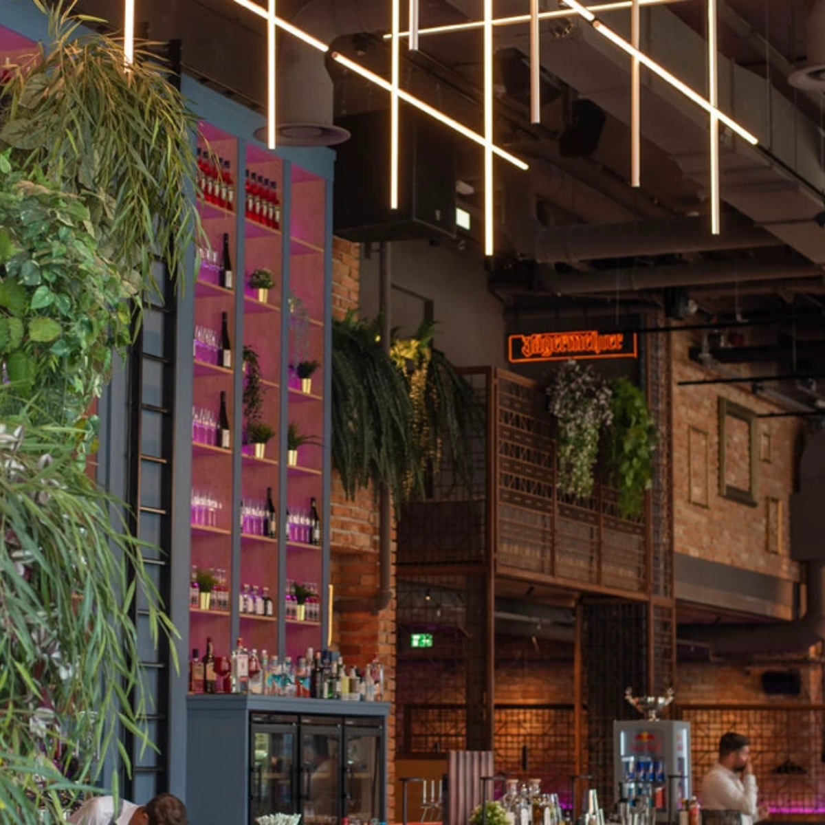 Das Interieur mit sieben Meter hohen Decken, offenen Stahlträgern, vergoldeten Flatscreens nebst Leuchtschriftzug an den Wänden und viel Grün erinnert an kultige New Yorker Bars, die lässige Atmosphäre ähnelt Berliner Restaurants und die regelmäßigen Live-Acts vermitteln das Gefühl, im kulturaffinen London zu sein.
