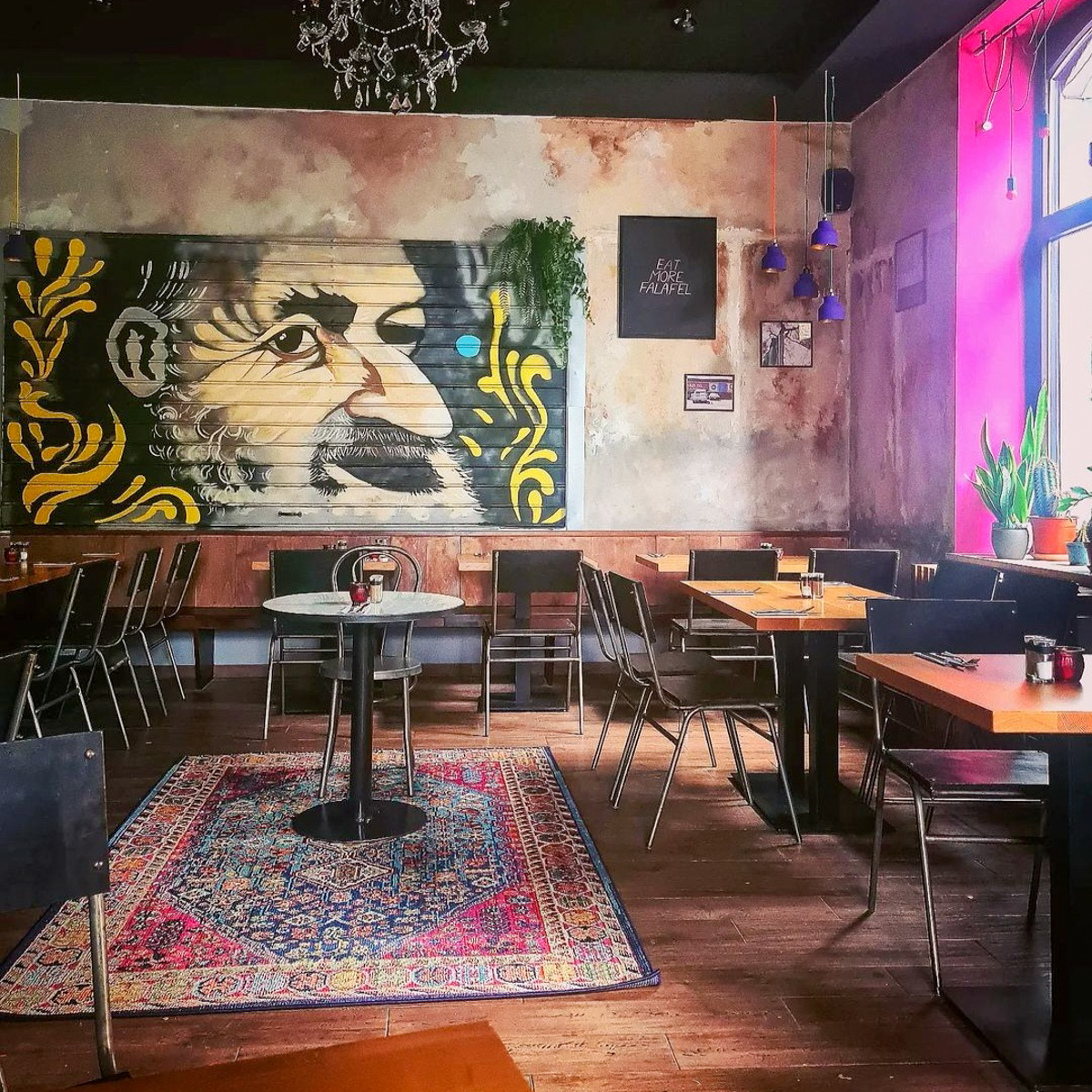 Florentin bezieht sich übrigens auf das gleichnamige, fröhlich bunte Viertel von Tel Aviv, das für seinen altmodischen, ausgelassenen Charme bekannt ist. Diesen findet man nun in München wieder – nicht zuletzt dank des nonchalanten Ambientes: XXL-Graffiti, einfache Holztische, Perserteppich, unverputzte Wände.