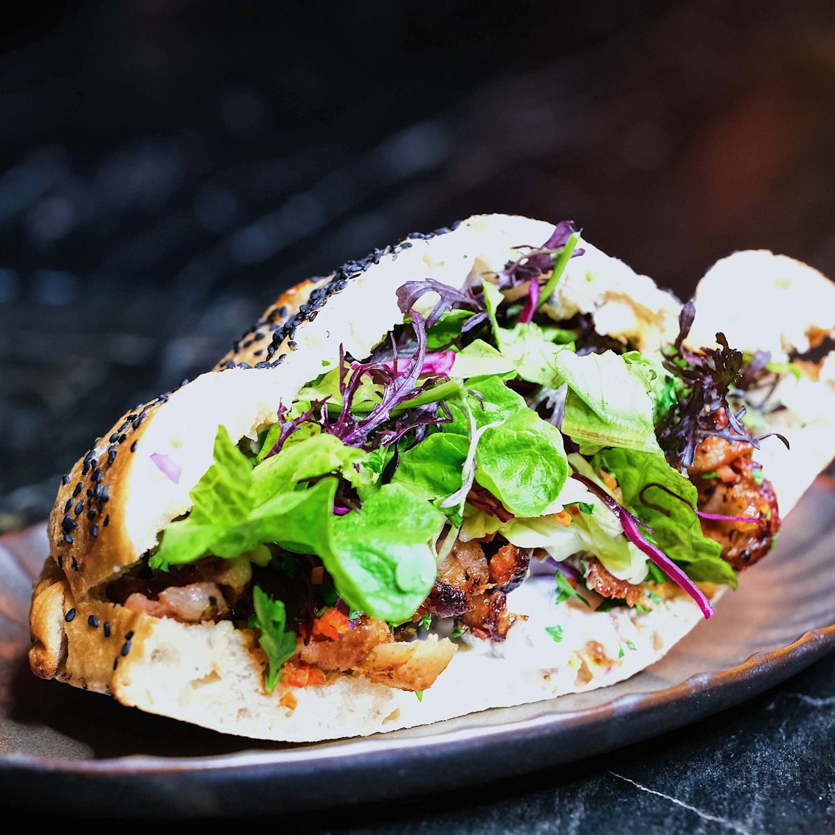 Wir staunen nach dem ersten Bissen über die fluffig-knusprige Konsistenz vom Brot und genießen die grandiose Sauce – natürlich ein geheimes Hausrezept. Doch so viel sei gesagt: Neben dem Fleisch gibt es einen köstlichen Mix aus fermentiertem schwarzem Knoblauch, hausgemachtem Kimchi, Kresse, Paprika, Chili, Blattsalat, Zwiebeln und Filderkraut, einer Weißkohl-Sorte.