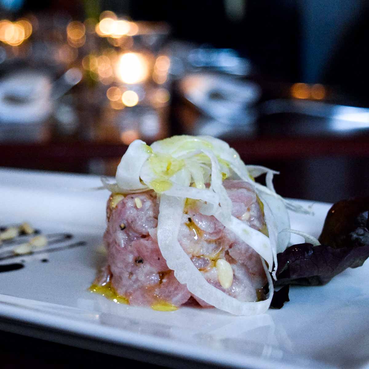 Los geht es mit einem grob geschnittenen Rindertartar, das wir mit Ei, Kapern, Frühlingszwiebeln und Gewürzgurken serviert bekommen. Beim Wein steigen wir mit einem leichten Lugana ein. Auf der nächsten Etappe unserer kleinen kulinarischen Reise durch die Küche des Arte in Tavola dreht sich alles um hausgemachte Pasta. Zuerst kosten wir Ravioli, gefüllt mit Ricotta, Kartoffeln und Trüffeln. Das ganze an einer feinen Butter-Sahne-Sauce und mit Trüffeln on-top.