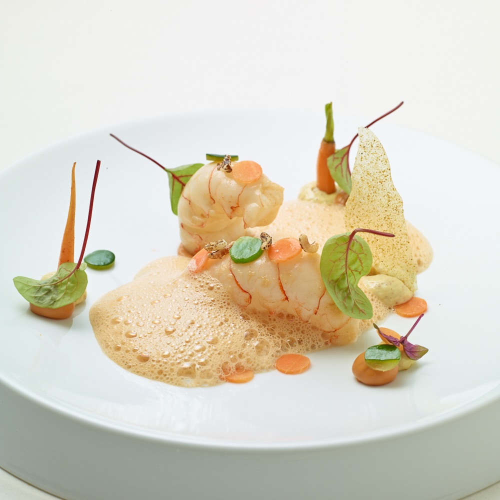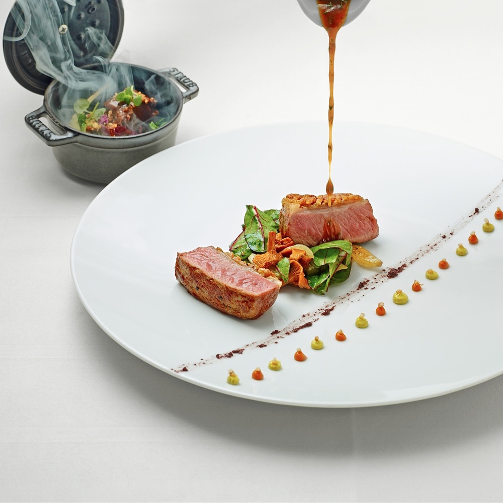 Diese beginnt mehr als vielversprechend mit einem prickelnden Tropfen aus dem familieneigenen Elsässer Weingut – passenderweise ergänzt mit einer Mini-Version des für die Region bekannten Flammkuchens. Der zweite Gruß aus der Küche – eine Steinpilzessenz in "Espresso-Form" – wird erneut begleitet von der köstlichen Kleinstvariante eines Klassikers: ein winziger Burger mit zarter Putenbrust und Trüffelcrème findet sich auf dem Teller. Nicht nur die Servierweise auf asiatischer Keramik, sondern auch die Kombination aus Sesam und leichter Schärfe geben uns eine erste genauere Idee, was es mit der "modernen französischen Küche mit japanischem Einfluss" des Restaurants auf sich haben könnte...