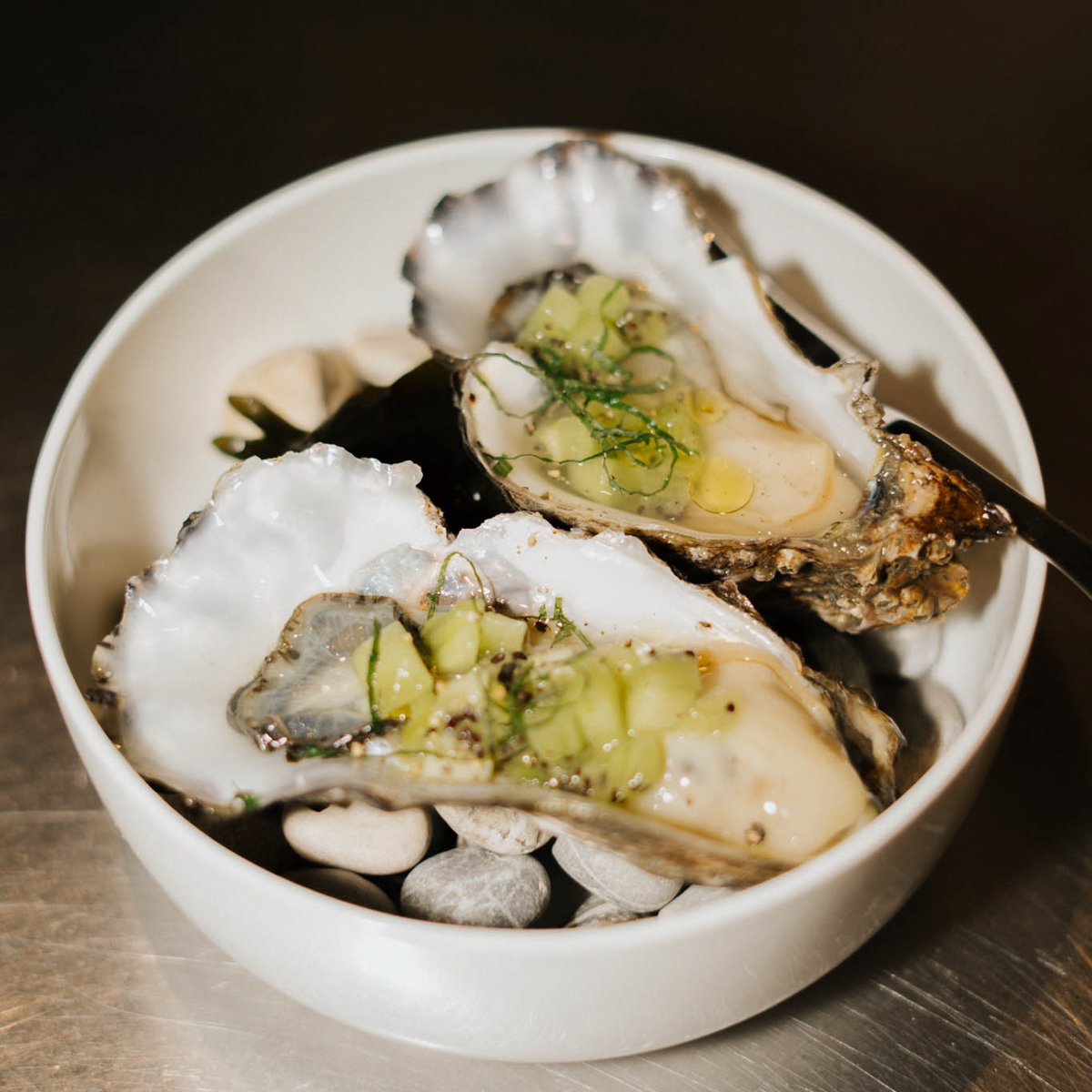 Es sitzt sich also schon mal sehr gut im Malva. Doch was viel wichtiger ist: Es isst sich auch so! Austern aus der Glut, gegrillte Erbsen mit fermentierter Stachelbeere oder Sauerteig-Donut mit Mispeln: Die Gerichte sind vorwiegend vegetarisch, die Zubereitung kreativ und die Zutaten auf Top-Niveau. Es gibt ausschließlich 4-Gang-Menüs, aber Austern stehen immer zusätzlich auf der Karte, sofern es keinen Engpass beim Einkauf gibt.