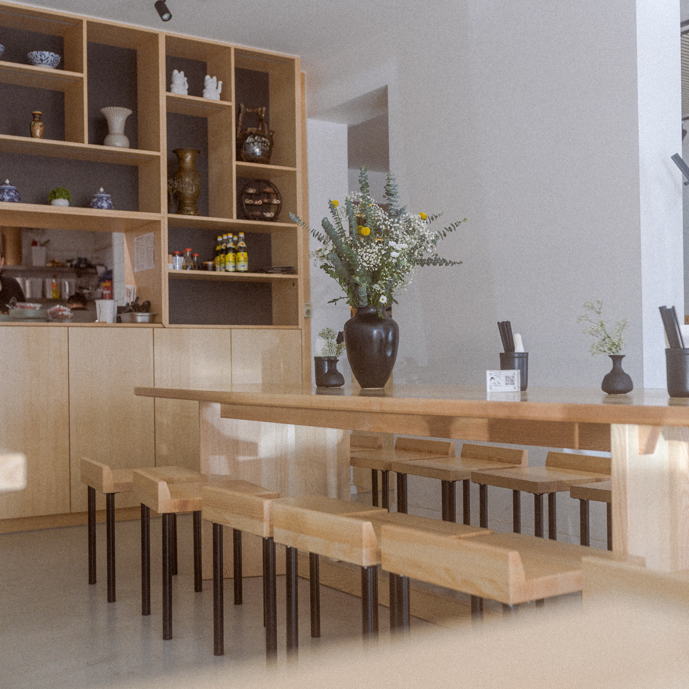 Auch bildet das minimalistische Ambiente mit hellen Holztischen und schwarzen Metallstühlen eine schöne Abwechslung zu manch einem anderen chinesischen Lokal, in dem oft schwere Stoffe und Rottöne vorherrschen. Kurzum: really not an average noodle shop!