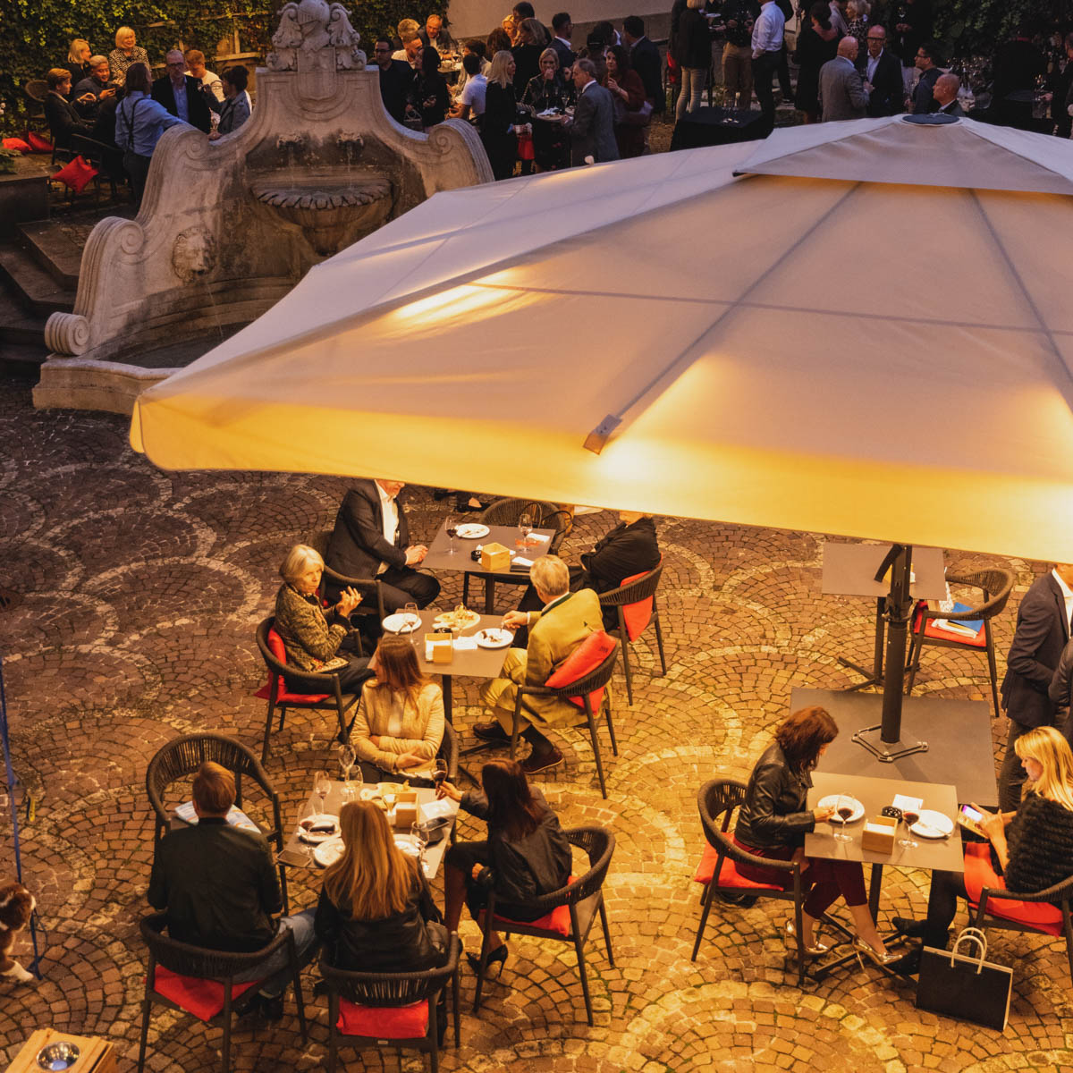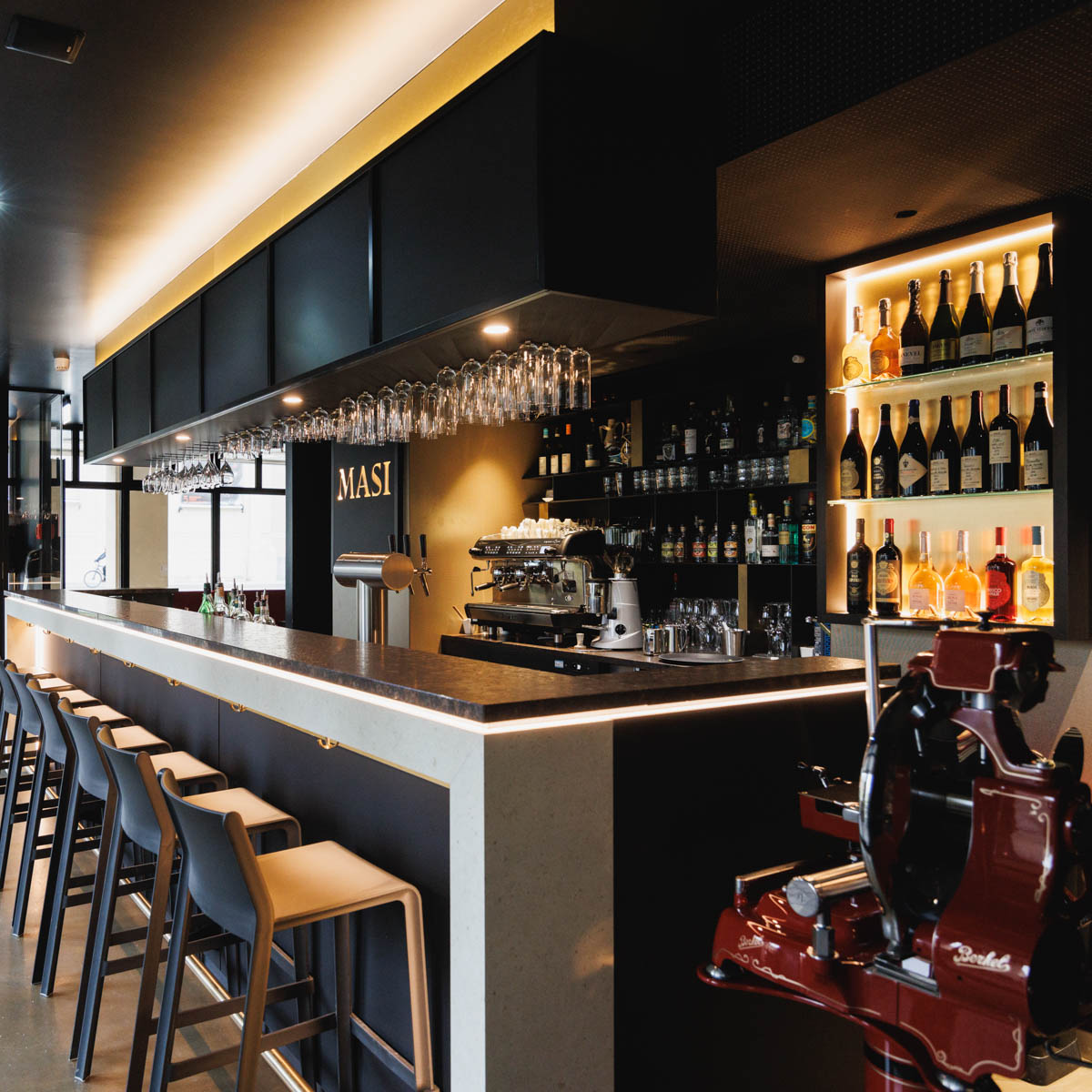 Genauso ansprechend wie die Masi-Gastronomie ist auch das Ambiente mit edlen Schwarz- und Rottönen, dunklem Holz und einem verglasten Weinkontor im rückwärtigen Teil des Lokals. Bei gutem Wetter lassen sich Antipasti-Platten, Cocktails, Weine und Co. übrigens besonders schön auf der begrünten Außen-Terrasse genießen mit Blick auf die historischen Gebäude der Maximilianstrasse, oder aber im ruhigen Innenhof.