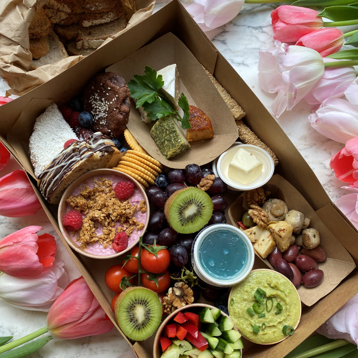 Jedes Wochenende bieten sie im Om Nom Nom feinste Käse- und Brunch-Boxen aus regionalen Produkten an, die komplett vegan sind und ohne tierische Bestandteile auskommen. Neben Leckereien, die ohnehin vegan sind wie etwa Hummus, hausgemachte italienische Antipasti und leckeres Obst kommt man hier auch in den Genuss veganer Kreationen wie Ceshew-Camembert, Carrot Lox oder BLT Bagel – alles ohne Tierleid, versteht sich. Derzeit kann man im Om Nom Nom online bestellen und Frühstück und leckere Snacks abholen.