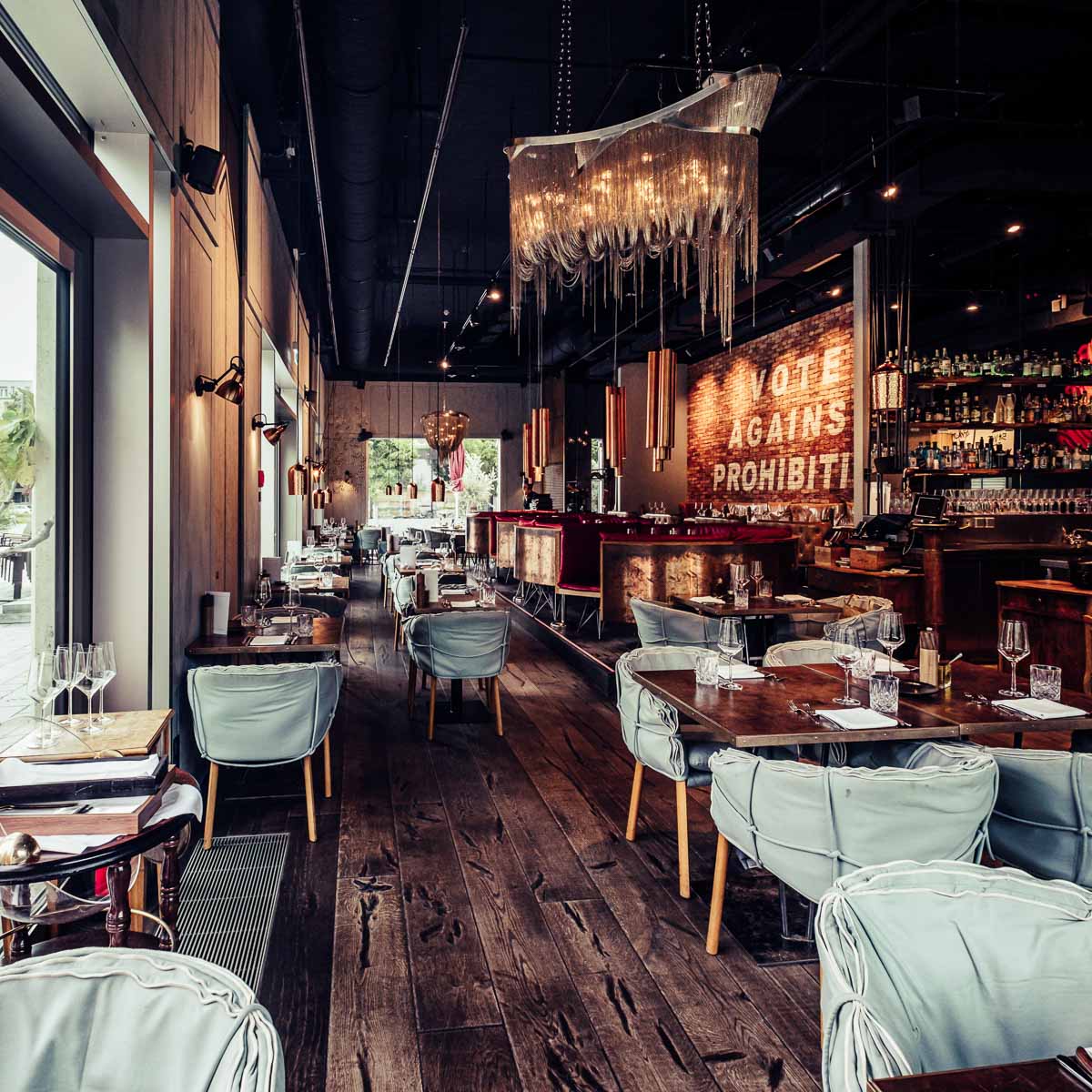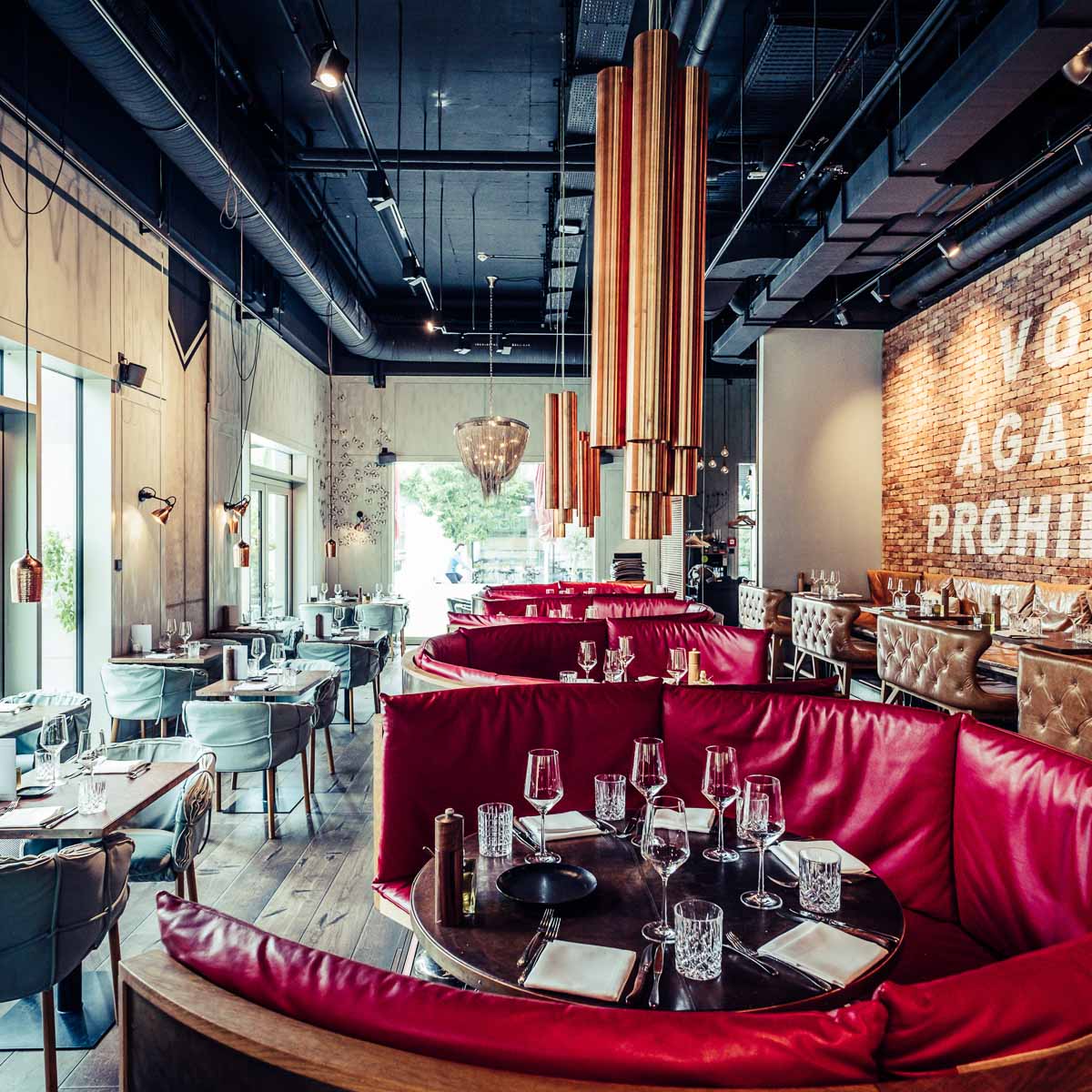 Es dominieren kühle Materialien wie Beton und Kupfer. Trotzdem wirkt das Restaurant einladend, wie das Wohnzimmer eines belesenen, aber jung gebliebenen Onkels. Das mag auch an den vielen kreativen Details liegen, etwa den Schmetterlings-Figuren in einer Ecke, der gemütlichen Chesterfield-Couch am Eingang oder den ausgefallenen Kronleuchtern aus feingliedrigen Metallketten an der Decke.