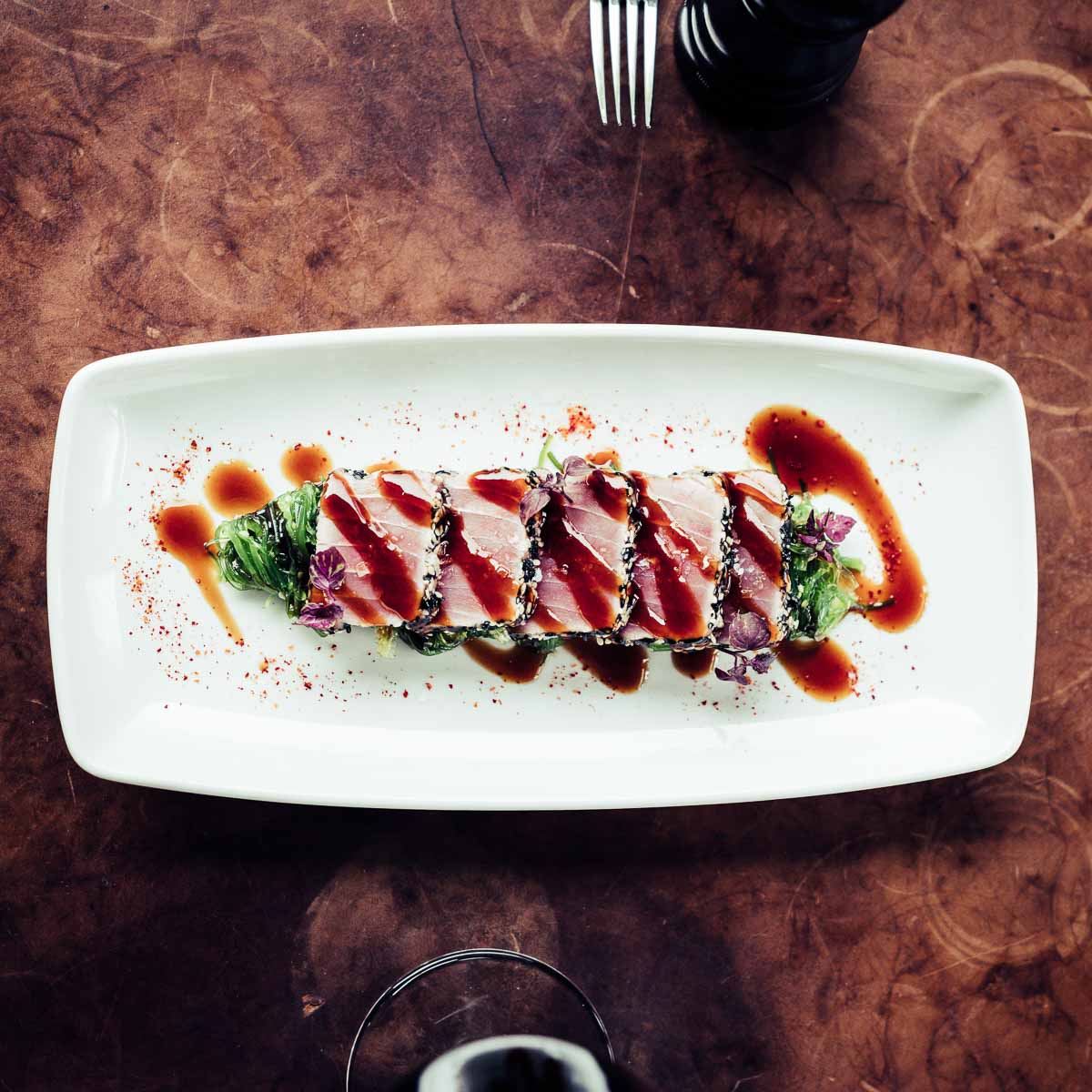 Als Vorspeise bekommen wir das wohl beste Roast Beef unseres Lebens serviert, mit Röstzwiebel-Mayonnaise und roter Zwiebelmarmelade. Außerdem gibt es ein Beef Tartare mit Kapernäpfel, geröstetem Malzbrot und Gartenkresse sowie eine Avocado-Variation: gebackene Avocado, Guacamole, Zitronengras, Sprossen und Tomaten – letztere schmecken so aromatisch wie im Italien-Urlaub. Dazu genießen wir ein Glas Grauburgunder aus der La Bohème Edition 2018 vom Weingut Neverland Wines aus Rheinhessen.