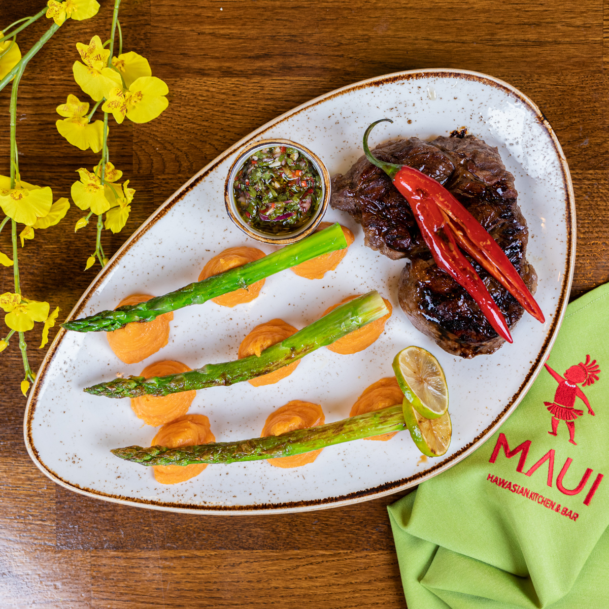 Der Name Maui steht für Vielseitigkeit, Offenheit, Neugier und das Miteinander insbesondere der pazifischen Kultur. Der Schriftzug im Restaurant "happiness is only real when shared" bringt es auf den Punkt. Und nach diesem Motto gestalten sich auch die Gerichte: Alle Vorspeisen sind zum Teilen gedacht, viele der Hauptgänge ebenfalls und können – sehr zu empfehlen – durch einen kleinen Grill in der Tischmitte individuell gegart werden.