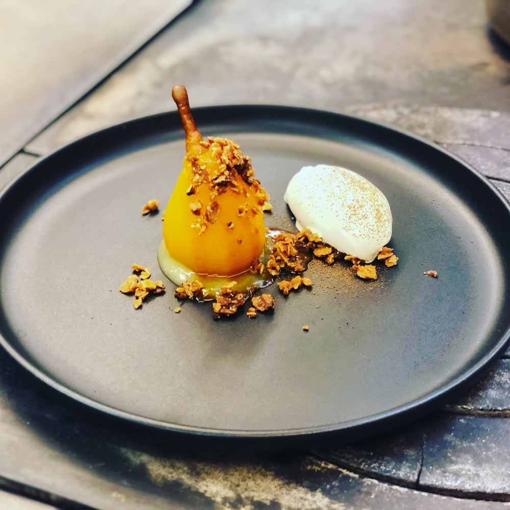 Was folgt sind sieben Gänge, einer schillernder als der andere: Teriyaki-Reh mit Erdbeerkern-Öl und Quitten-Essig, Novigrader Jakobsmuscheln mit Salzpflaume und lila Rettich an Beurre Blanc, ein dry aged Seeteufel, gefolgt von einer getrüffelten Taube aus dem Salzkammergut sowie einer Gams mit Vogelbeeren, Kürbiscreme und geraspelten Steinpilzen.