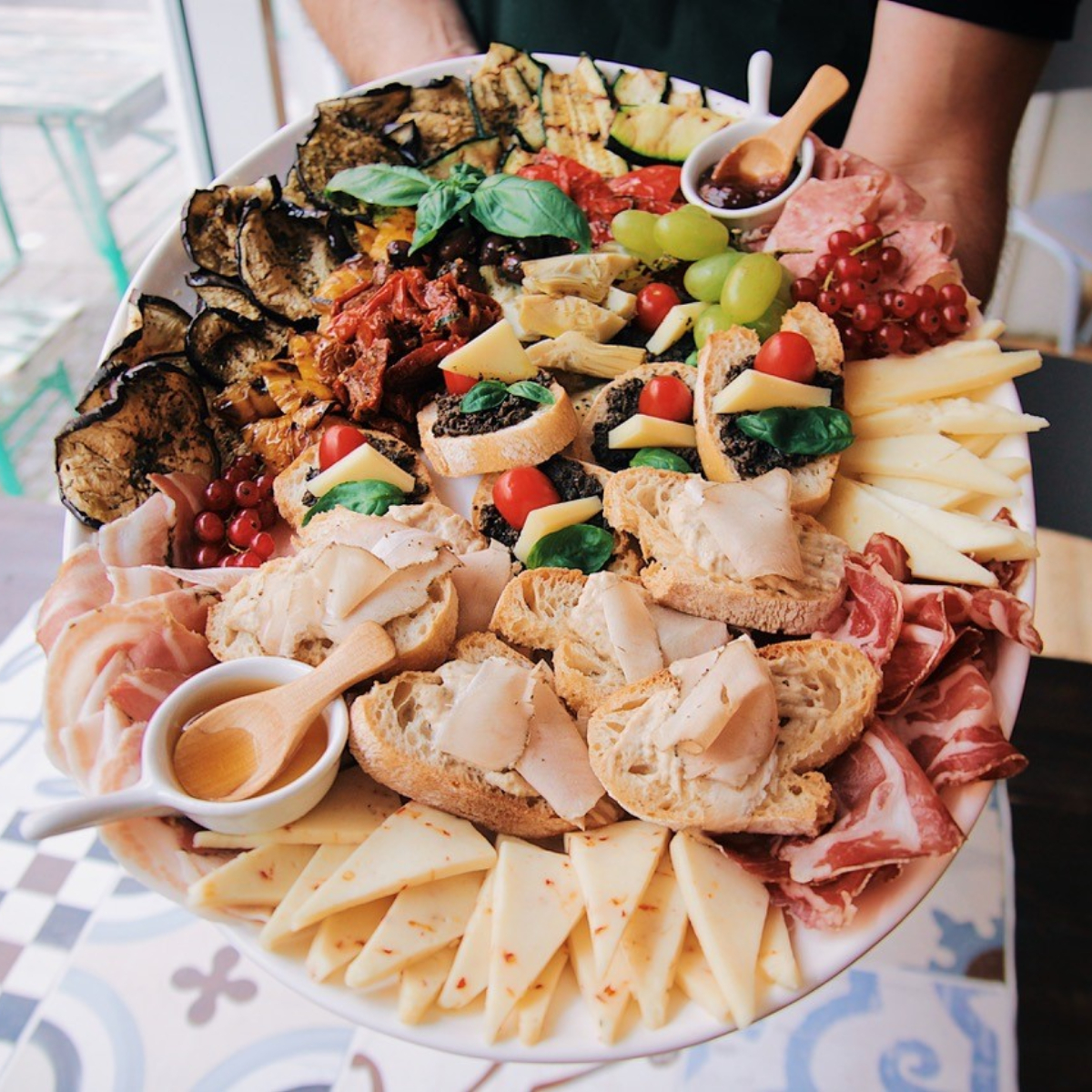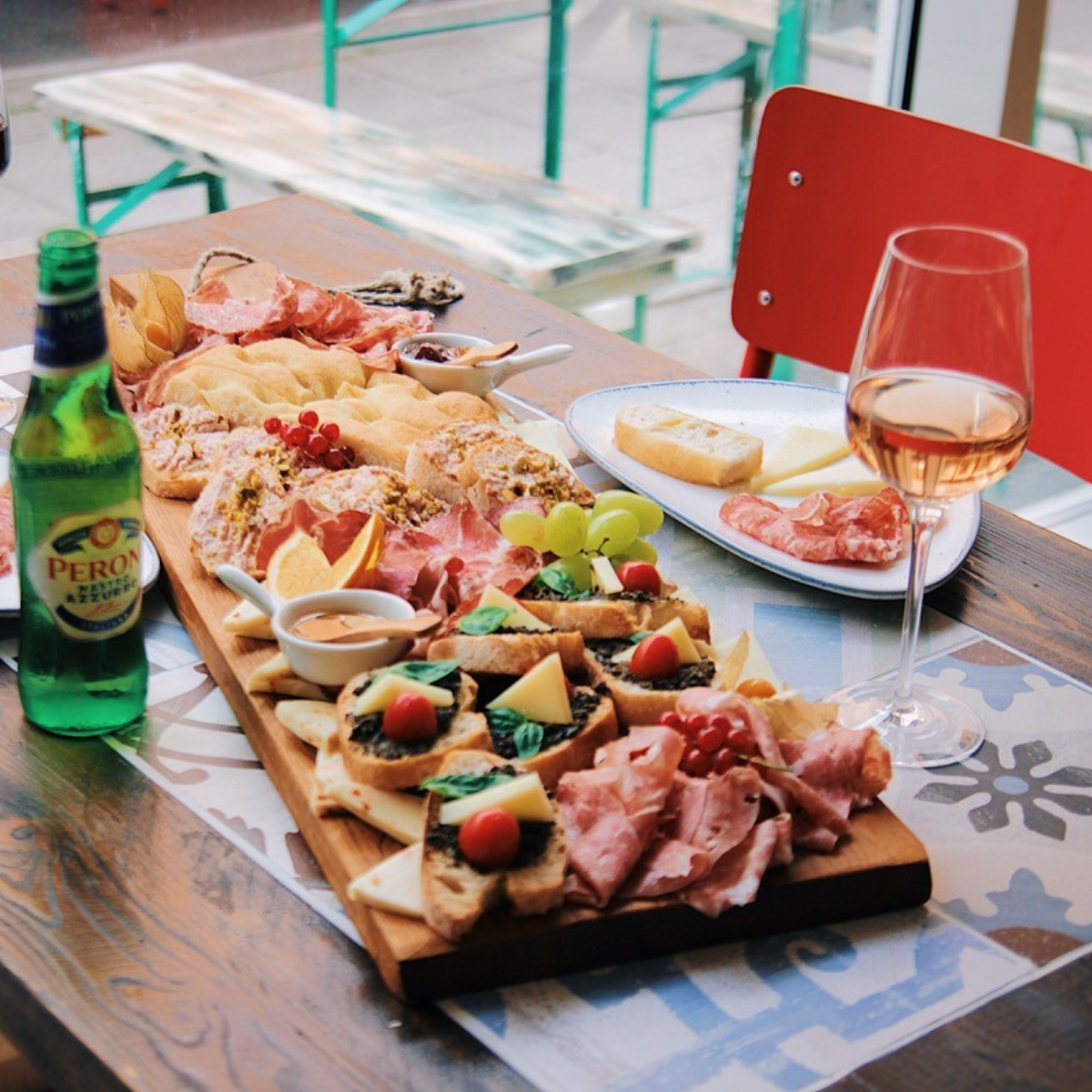 Wir können uns weder sattsehen noch -essen an den vielen Platten mit italienischem Genuss oben drauf, die Massimo liebevoll her- und anrichtet. Alle Speisen kann man übrigens auch bequem per Whats App zum Abholen bestellen, oder gleich die ganze Bottega exklusiv mieten und sich rundum verwöhnen lassen von aromatischen Oliven, prickelndem Spritz und herrlich krossem Brot.