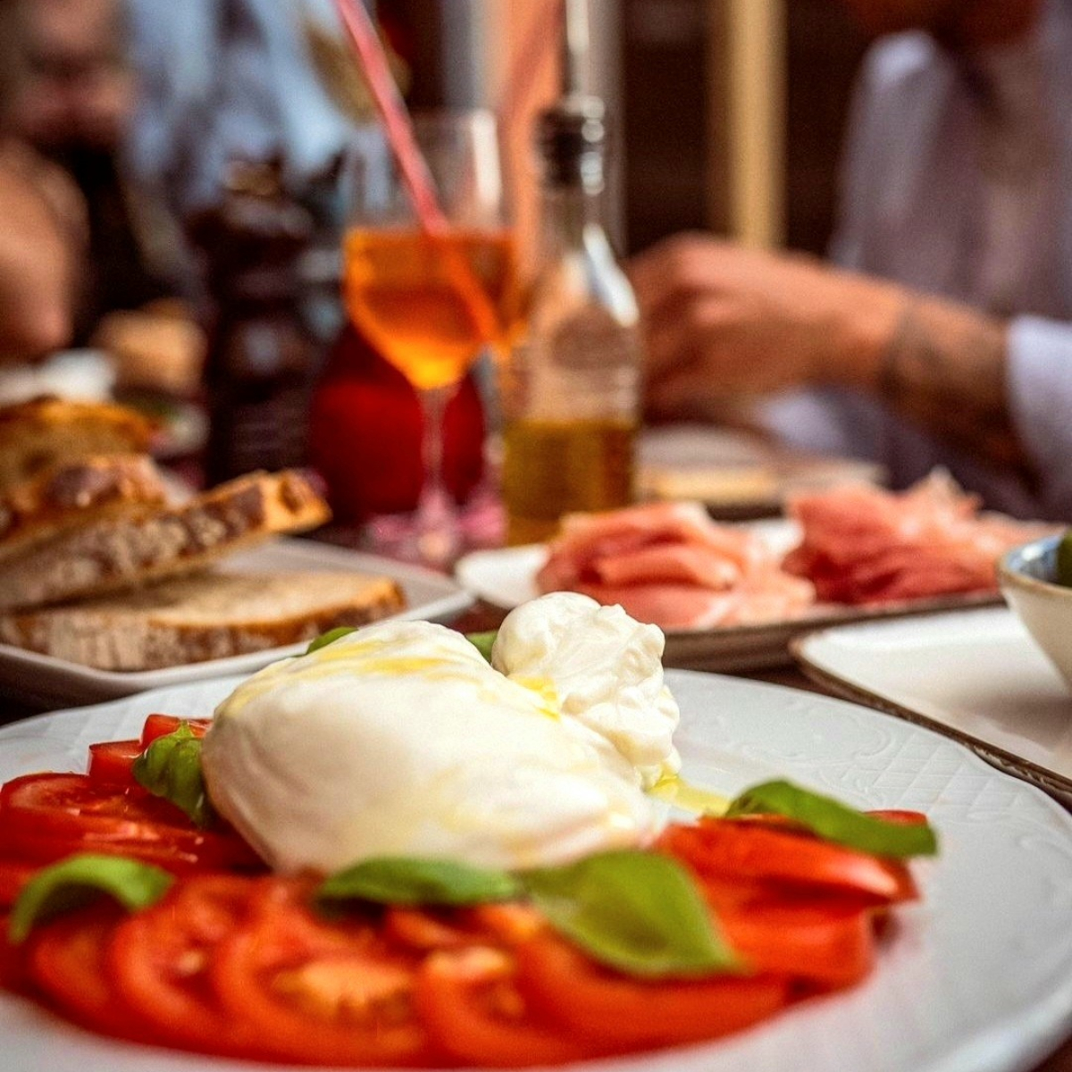 Der wunderbar cremige Mozzarella stammt von Büffeln nahe Neapel. Dazu gibt es ein rassiges Olivenöl, sonnengereifte Tomaten und Weißbrot, das nach italienischem Vorbild von der Münchner Brotmanufaktur Schmidt gebacken wird.