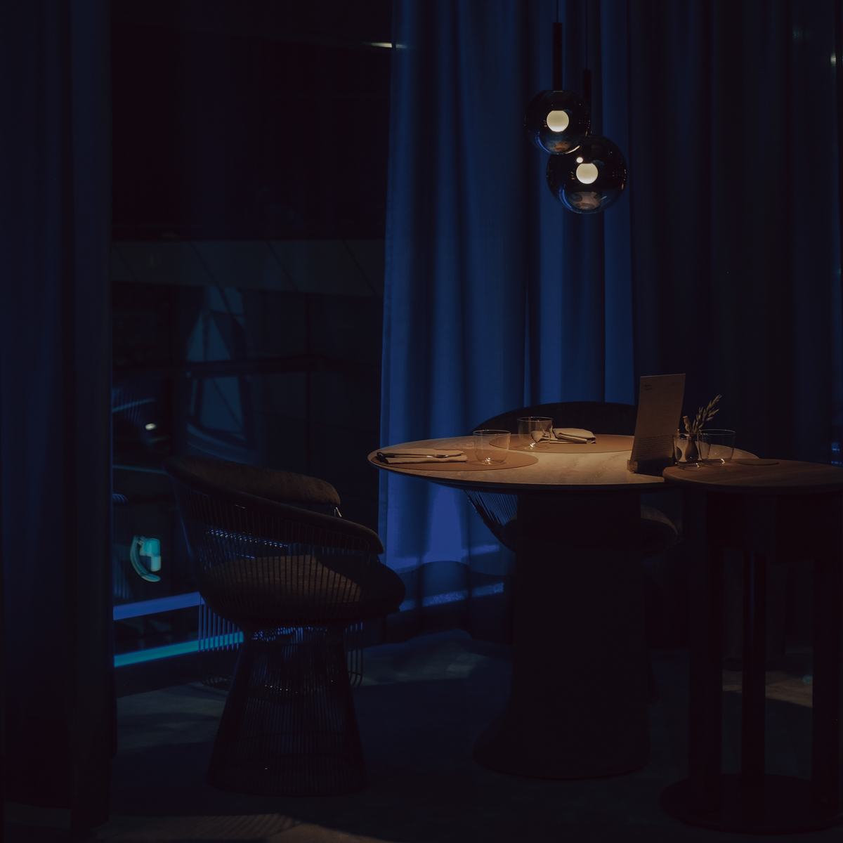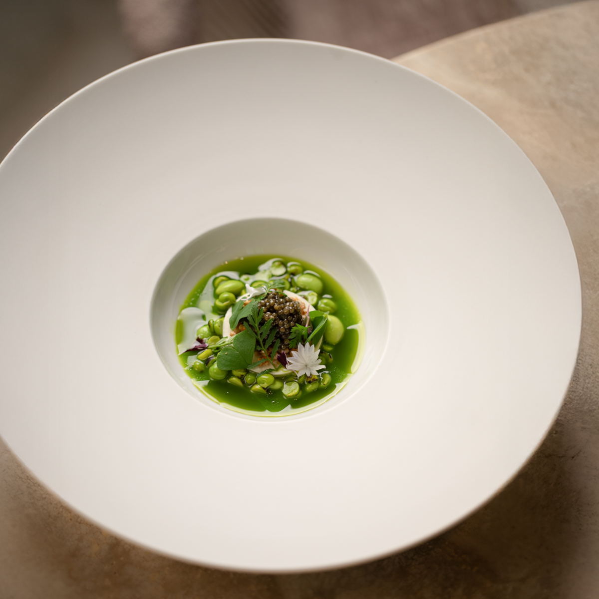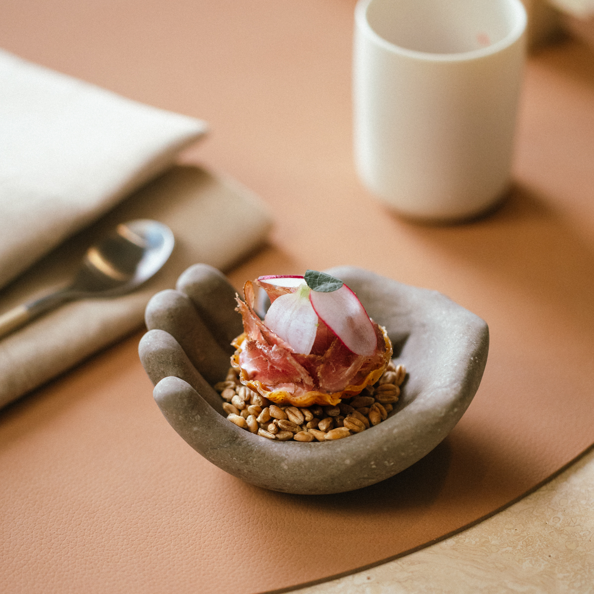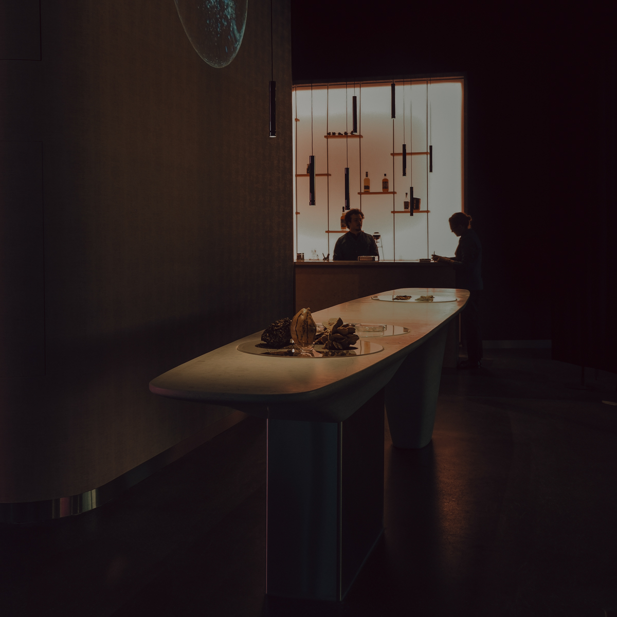 "Wir wollen eine neue Art des Fine Dining präsentieren – weltoffen und inspiriert von den besten Traditionen aus aller Welt", erklärt Madsen. Gespeist wird dabei in den ehemaligen Räumlichkeiten des Zwei-Sterne-Restaurants Esszimmer, die nun neu eingekleidet wurden in ein clean-schickes Ambiente in gedeckten Tönen samt dekorativem Wolken-Ensemble, das in der Mitte des Speiseraums von der Decke schwebt.