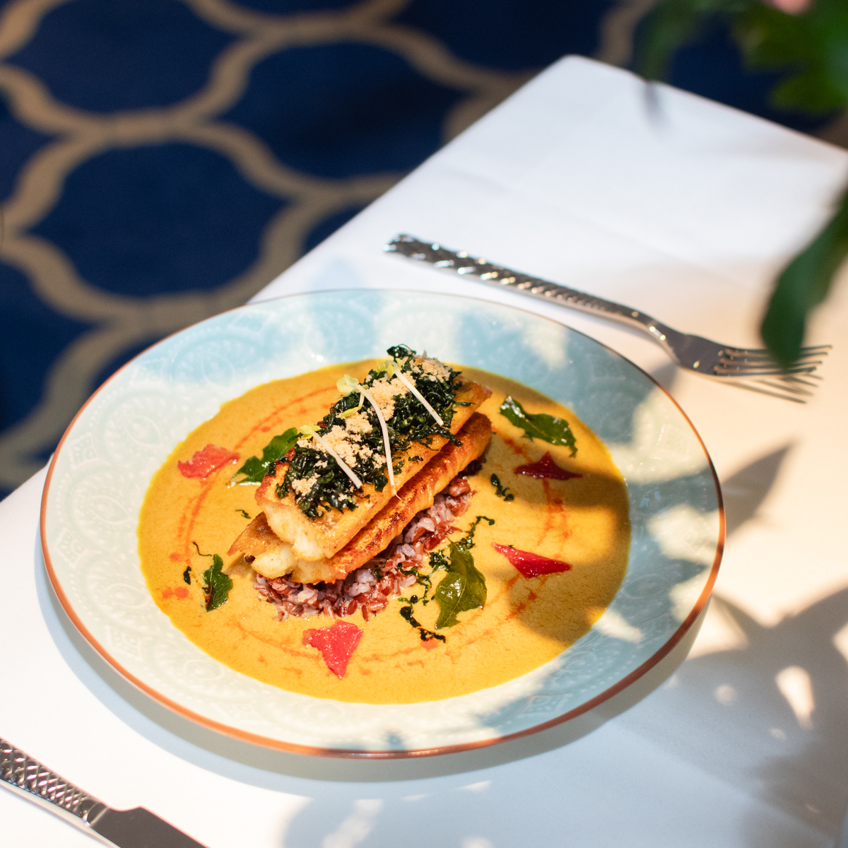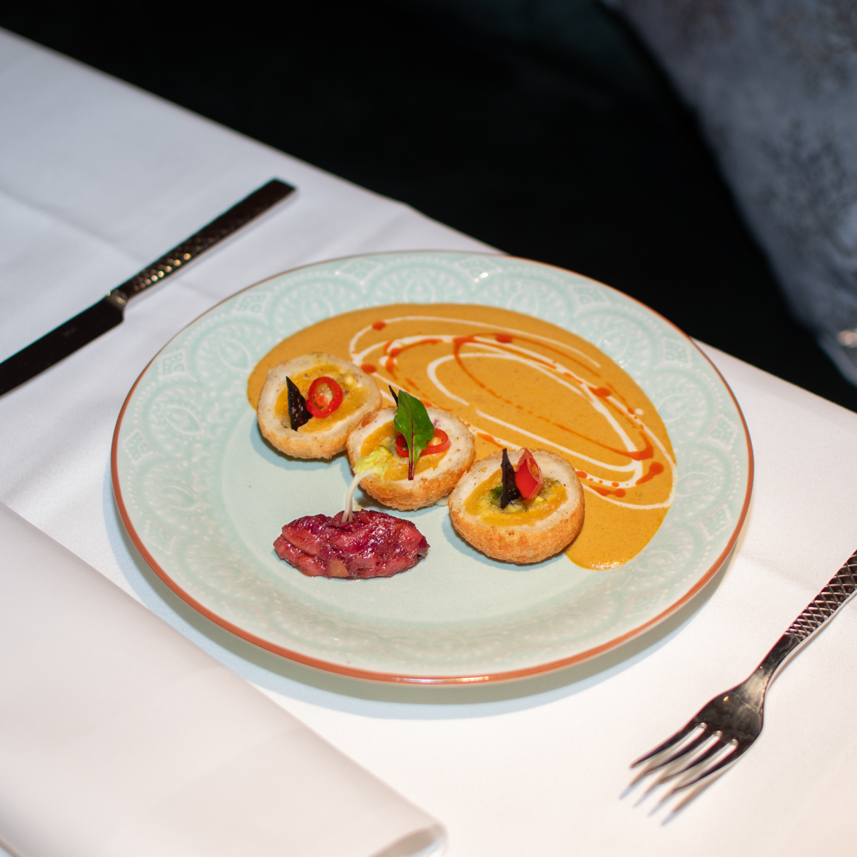 Dabei ist zu jeder Zeit die Präsentation jedes Gerichts im The Indian Room nicht nur ein Fest für die Geschmacksnerven, sondern auch die Augen. Chefkoch Devraj Bhatt versteht es durch seine langjährige Tätigkeit in Fünf-Sterne-Hotels, Gänge wie den knusprigen Grünkohl (Vorspeise) oder das klassische Butter Chicken (Hauptspeise) extrem ästhetisch anzurichten. "Unsere wichtigsten Gewürze wie Safran oder Kashmiri Chilli Pulver beziehen wir direkt aus Indien, um so authentisch wie möglich zu kochen."