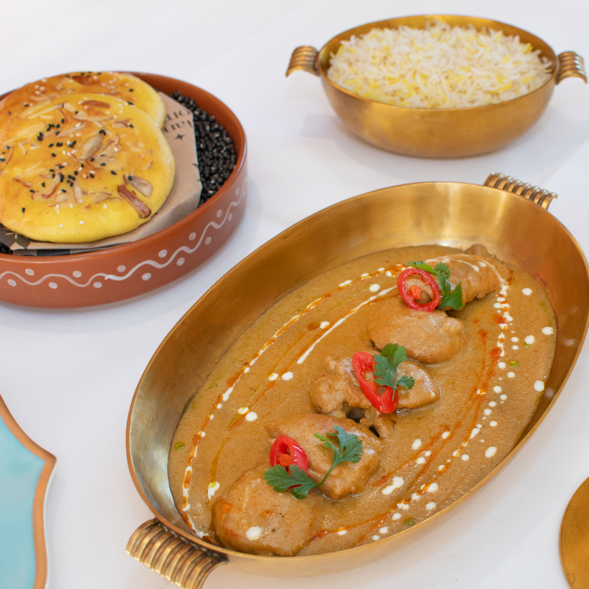 Unsere Entdeckung des Abends: Die geschmorte Lammschulter mit Safran, zu der ein leicht süßes, hausgemachtes Fladenbrot namens Sheermal in einer hübschen goldenen Schale gereicht wird. Ebenso haben uns die leicht pikanten Tiger-Garnelen mit Basilikum, Kreuzkümmel und Joghurt begeistert und der hausgemachte indische Hüttenkäse mit Ingwer und Koriander.