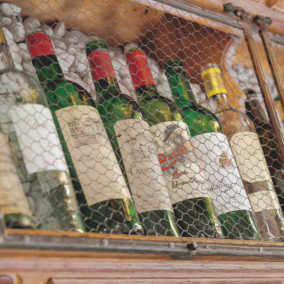Bevor wir zu dem Dessert kommen, machen wir eine kleine Pause. Wir begutachten die schönen, leeren Weinflaschen, die neben uns in der Vitrine stehen. Wer wohl diesen edlen französischen Tropfen von 1963 getrunken hat?