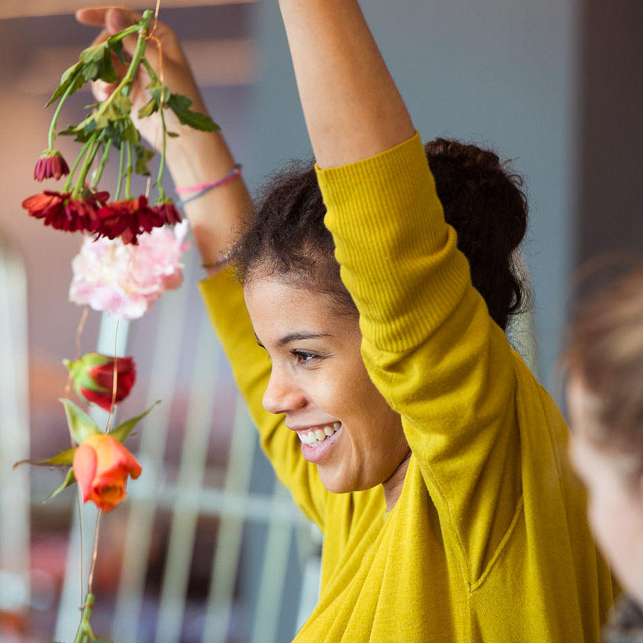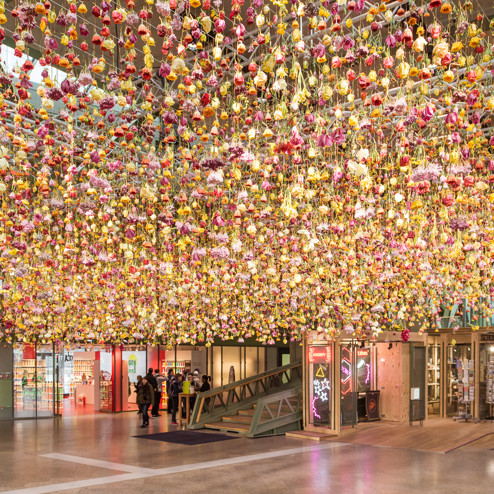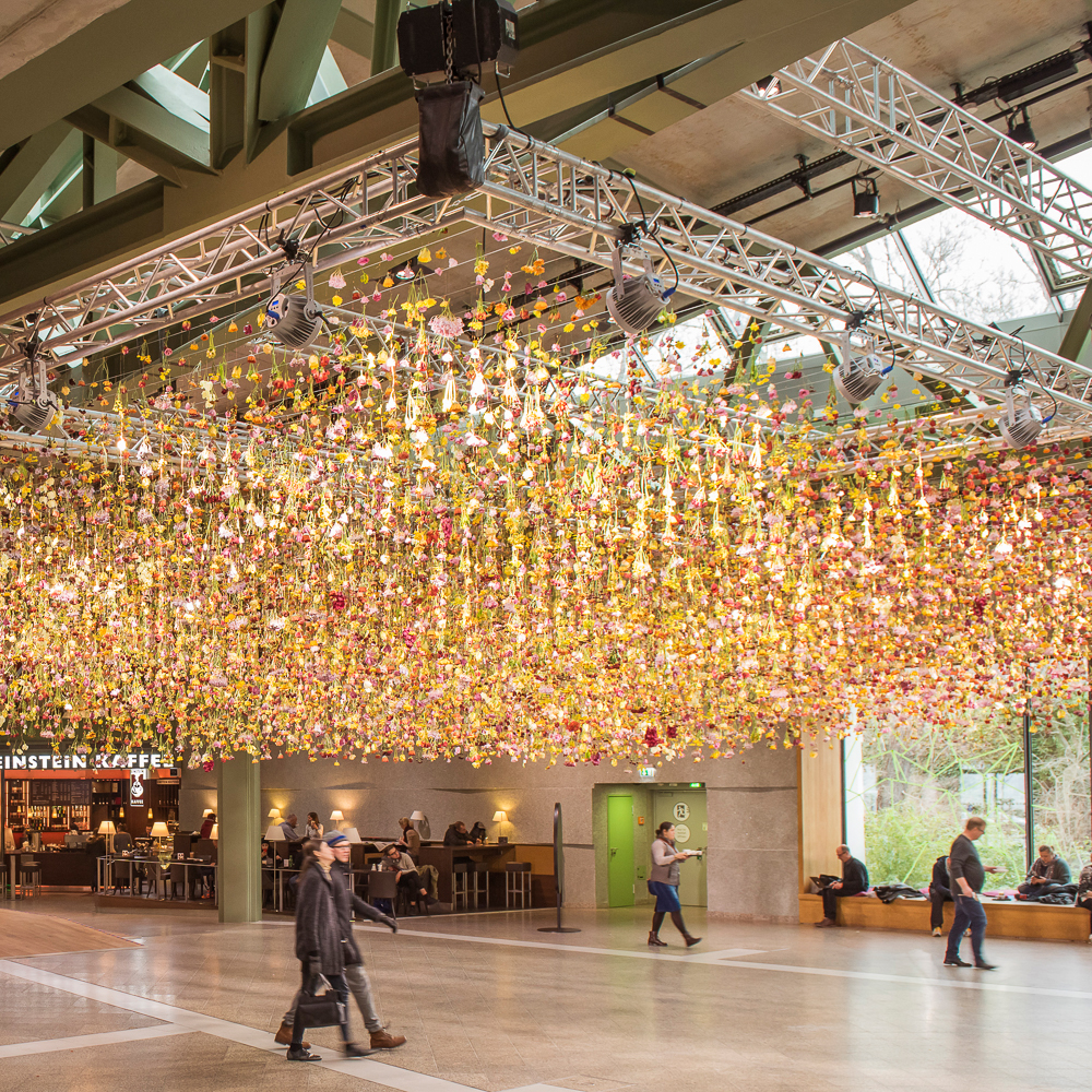 Ihre Arbeiten sind als bleibende Kunstwerke Teil des Interieurs großer Bauwerke und werden bei temporären Installationen aufgelöst und an anderer Stelle zu etwas ganz Neuem zusammengefügt oder am Ende verschenkt. Niemals allerdings werden sie einfach weggeworfen. Jede einzelne der Blumen hat auf diese Weise ihre ganz eigene Reise. Über eine Londoner Agentur ist nun die Zusammenarbeit mit der BIKINI BERLIN Concept Shopping Mall entstanden und hat 30.000 Blumen, gesponsert von der Inspirationswebsite Tollwasblumenmachen.de, auf den Anfang ihrer Reise gebracht. Noch bis zum 1. Mai präsentiert das Haus im Atrium des geschichtsträchtigen Baus, an zarten Kupferdrähten von der Decke hängend, ein berauschendes Blumenmeer. Zwanzig fleißige Hände haben an fünf Tagen das poetische Werk vollbracht.