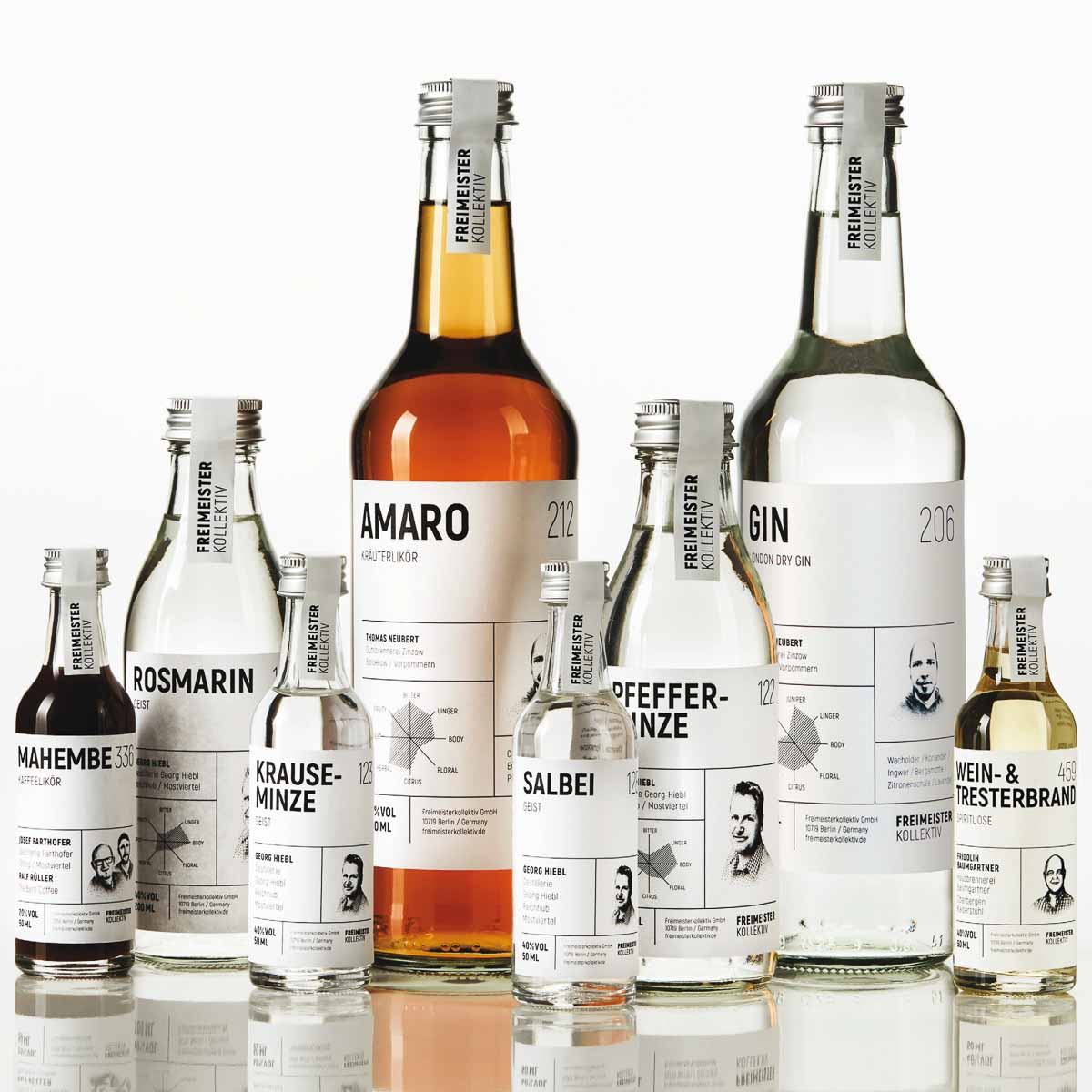 Dabei stammen die Produkte des Freimeisterkollektivs ausschließlich aus den Brennblasen des absoluten Who is Who der Craft Spirit Szene, darunter auch etliche Preisträger diverser Spirituosen-Auszeichnungen. Alle Produkte werden – oft sogar in einem gemeinschaftlichen Prozess – exklusiv für das Freimeisterkollektiv entwickelt.