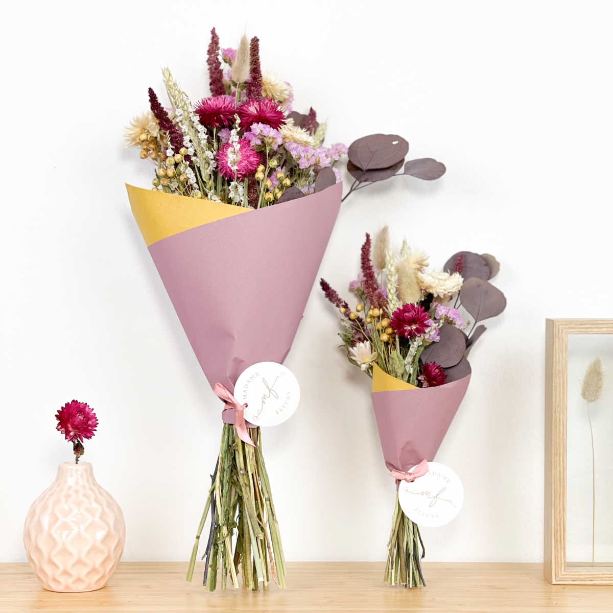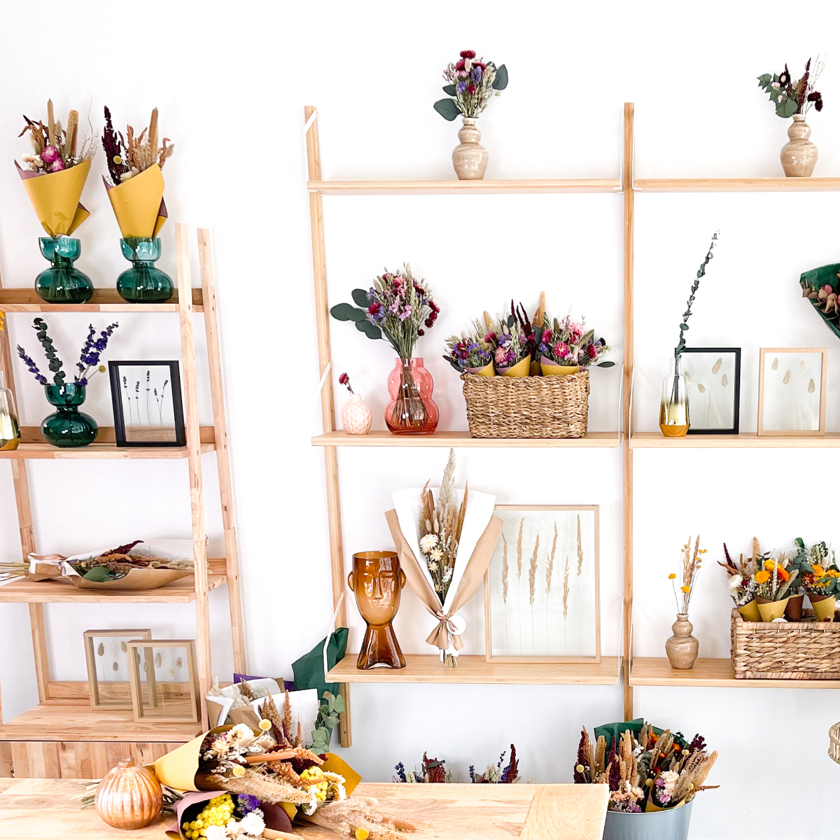 Doch nicht nur Sträuße lassen sich aus den bezaubernden Blumen, Pampasgräsern und Blättern stecken: dekorative Ringe mit Trocken-Gestecken oder Glas-Rahmen mit gepressten Blumen und Gräsern sowie passende Vasen für kleinere und größere Sträuße verschönern jedes Interieur. Zum Service von Madame Fleurs gehört auch, dass man immer eine persönliche Nachricht einbinden kann. Genau das Richtige für Geburtstage oder Muttertag, und einfach für Freund:innen, die man lange nicht gesehen hat.