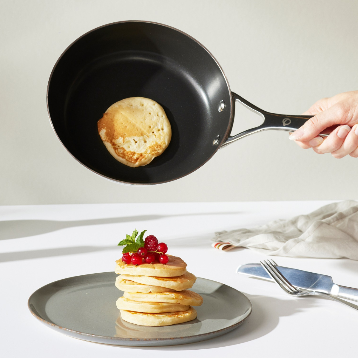 Und warum Kupfer? Kupfer ist das Metall der Profiköche, denn es hat eine extrem hohe Wärmeleitfähigkeit. Das sorgt für eine gleichmäßige Wärmeverteilung – so gelingt's auf auf den Punkt. Noch dazu sind die Olav-Pfannen des Startups keramisch beschichtet und bestehen aus einem 5-Schicht-Material, das Performance und Alltagstauglichkeit vereint. Er wird bereits bei niedriger Hitze heiß und macht damit alles ein bisschen leichter. Kein Anbrennen, kein Stress. Kochen ohne viel Öl.