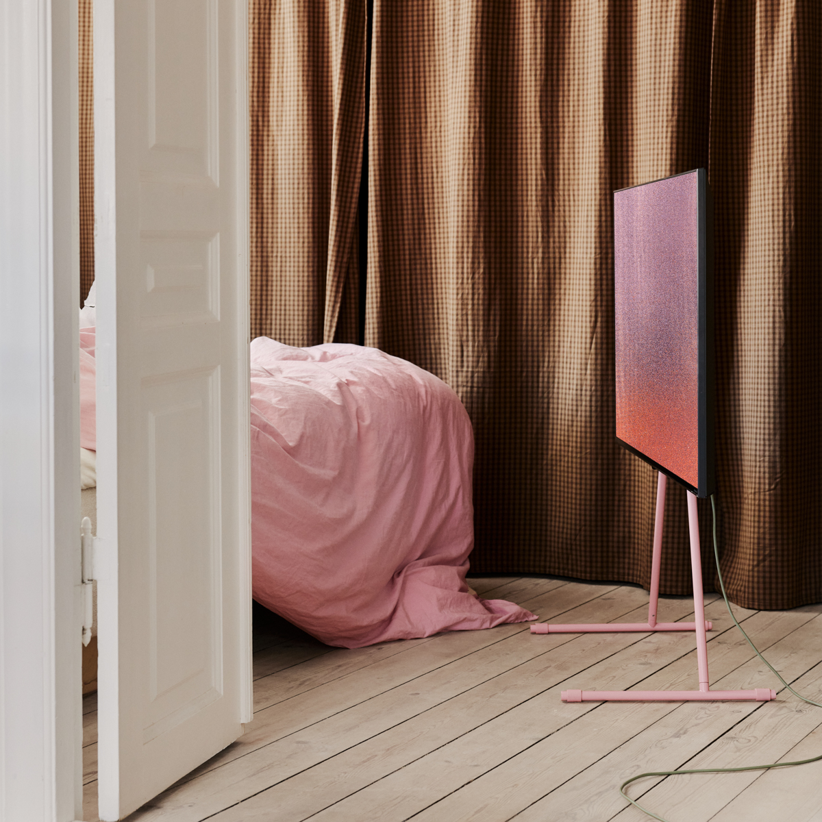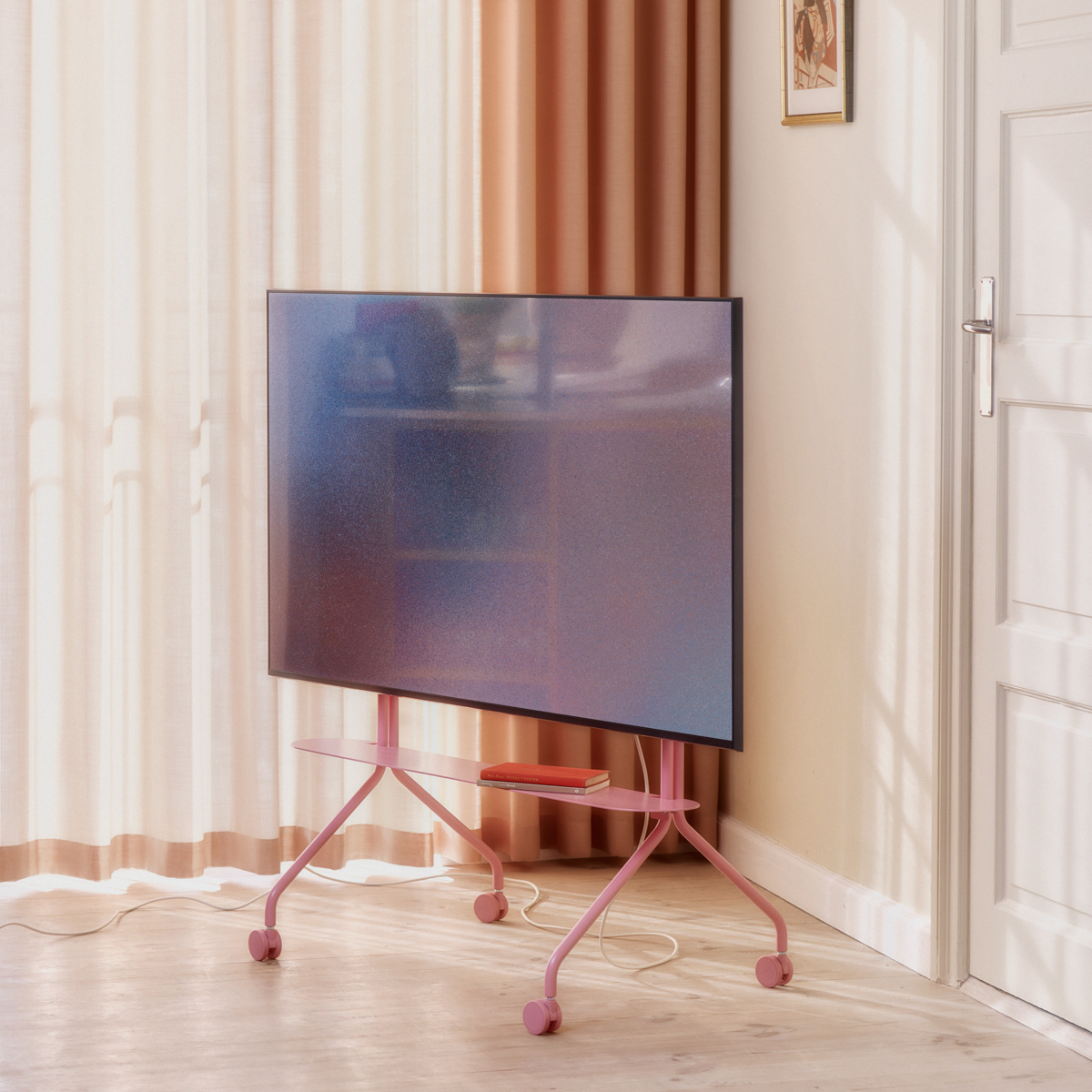 Ein TV‑Ständer in knalligem Rosa? Funktioniert super! Der Moon Rollin’-Stand, eine sanft geschwungene, rollbare Stahlkonstruktion, bringt Leichtigkeit ins Wohnzimmer – ein Designobjekt mit subtiler Ironie, das sich spielerisch präsentiert, ohne aufgesetzt zu wirken. Ebenso unaufgeregt ist der kompaktere Viva-Stand im selben Farbton – eine kleine, mobile Bühne, kaum mehr als ein Gestell.