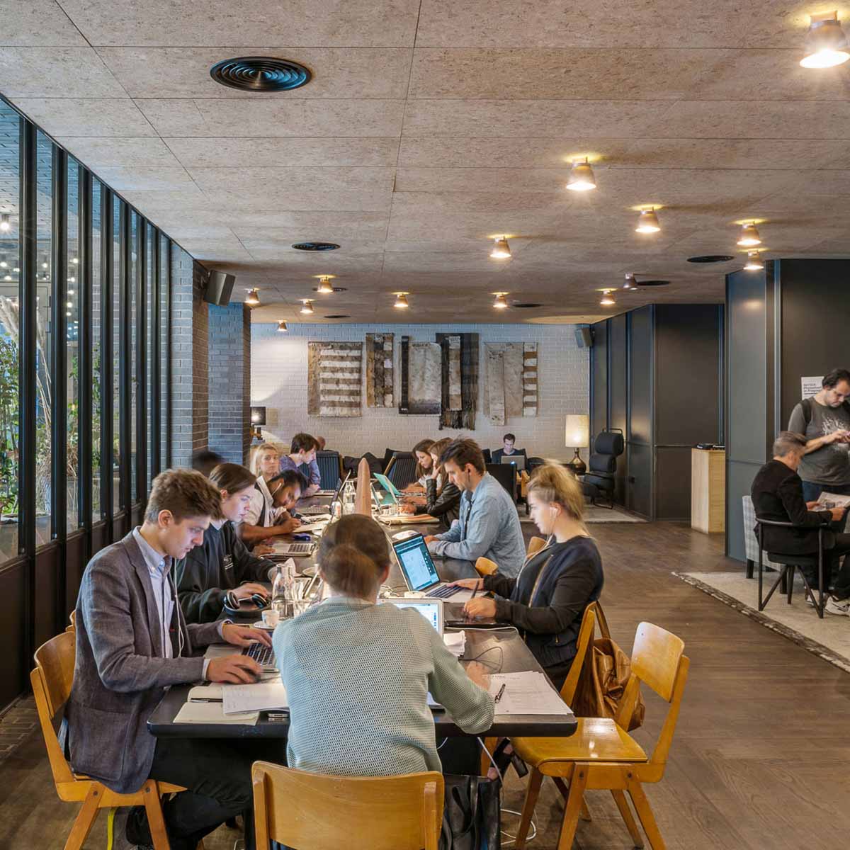 So ist bereits der Empfang an der Tür äußerst herzlich. Überall wird gelacht und geplauscht. Alle sind freundlich und gut gelaunt. Die Rezeption sieht aus wie ein Plattenladen und geht direkt in einen weitläufigen, lässig gestaltetet Bereich über, in dem sowohl gearbeitet als auch entspannt werden kann. Ein Co-Working Space mit Wohnzimmer-Atmosphäre. Oder umgekehrt.