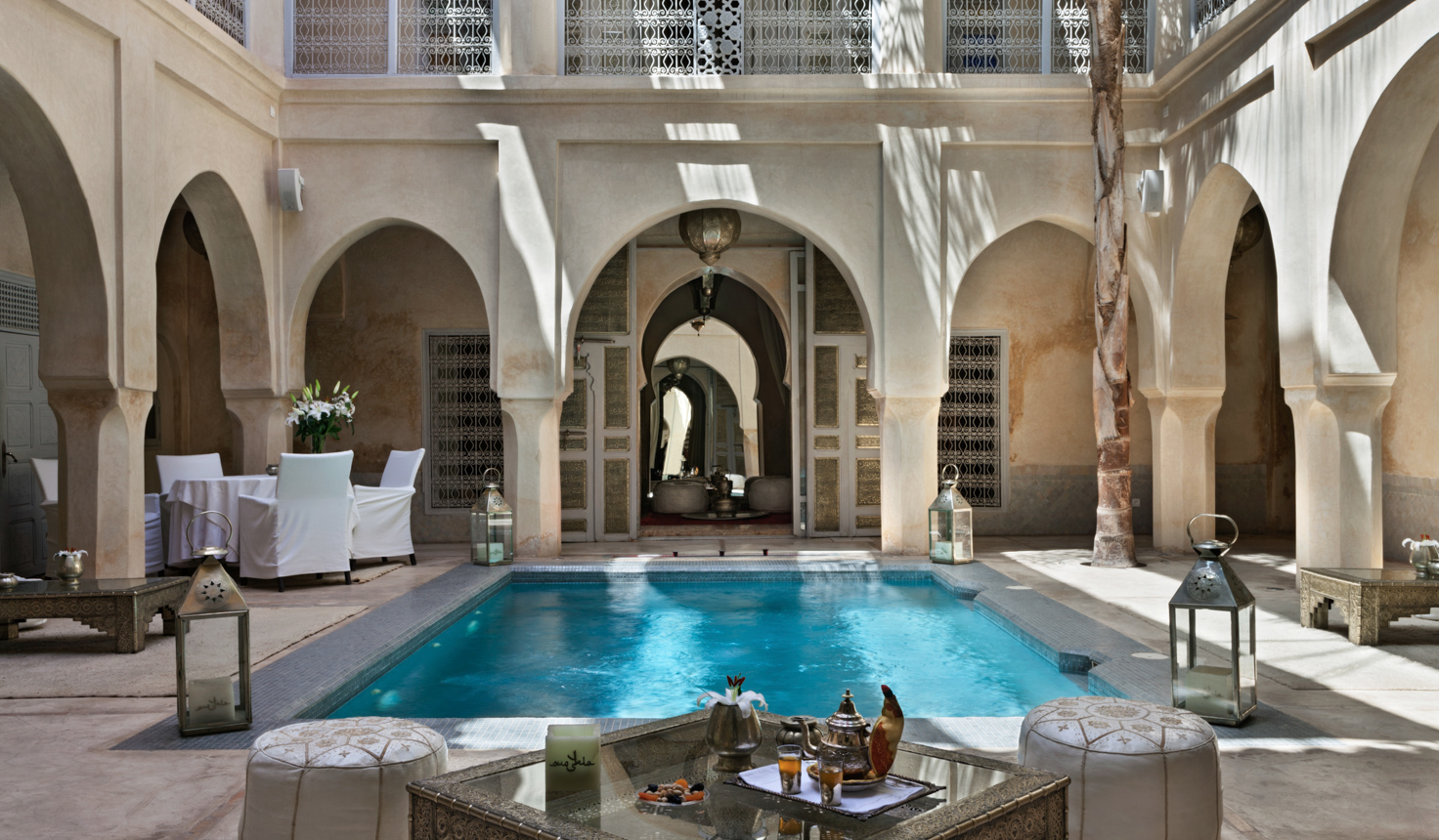 Versteckt und abgeschirmt vom Trubel der quirligen Altstadt empfangen einen Riads mit einer wohltuenden Ruhe. In ihnen verborgen liegen zauberhafte Welten in Form verschnörkelter türkisleuchtender Brunnen und üppig-grüner Gärten. In den Mauern eines 300 Jahre alten Stadtpalastes fügt sich das Anayela Hotel nicht nur in architektonischer Hinsicht auf zauberhafte Art in die marokkanische Tradition.