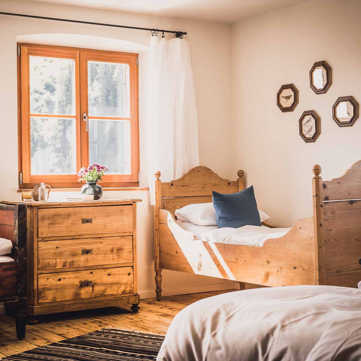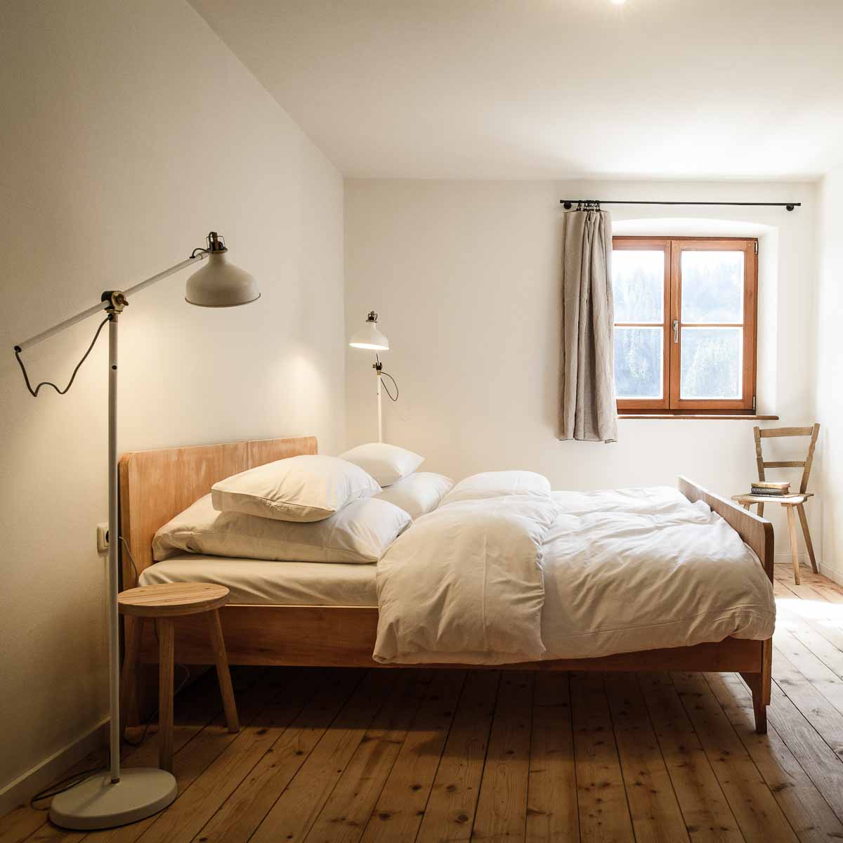 Auf den modern-urig eingerichteten Zimmern mit Leinen-Vorhängen, Industrielampen und Bluetooth-Plattenspieler gibt es kuschlige Bademäntel und Hausschuhe, ein Waschbecken sowie die herrlich duftenden Seifen, Shampoos und Lotionen mit ätherischen Ölen des österreichischen Beautylabels Susanne Kaufmann.