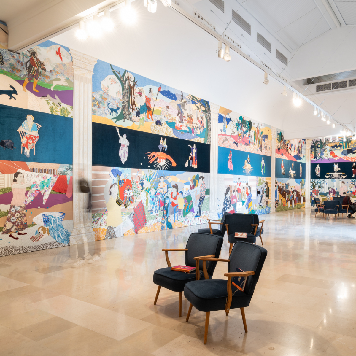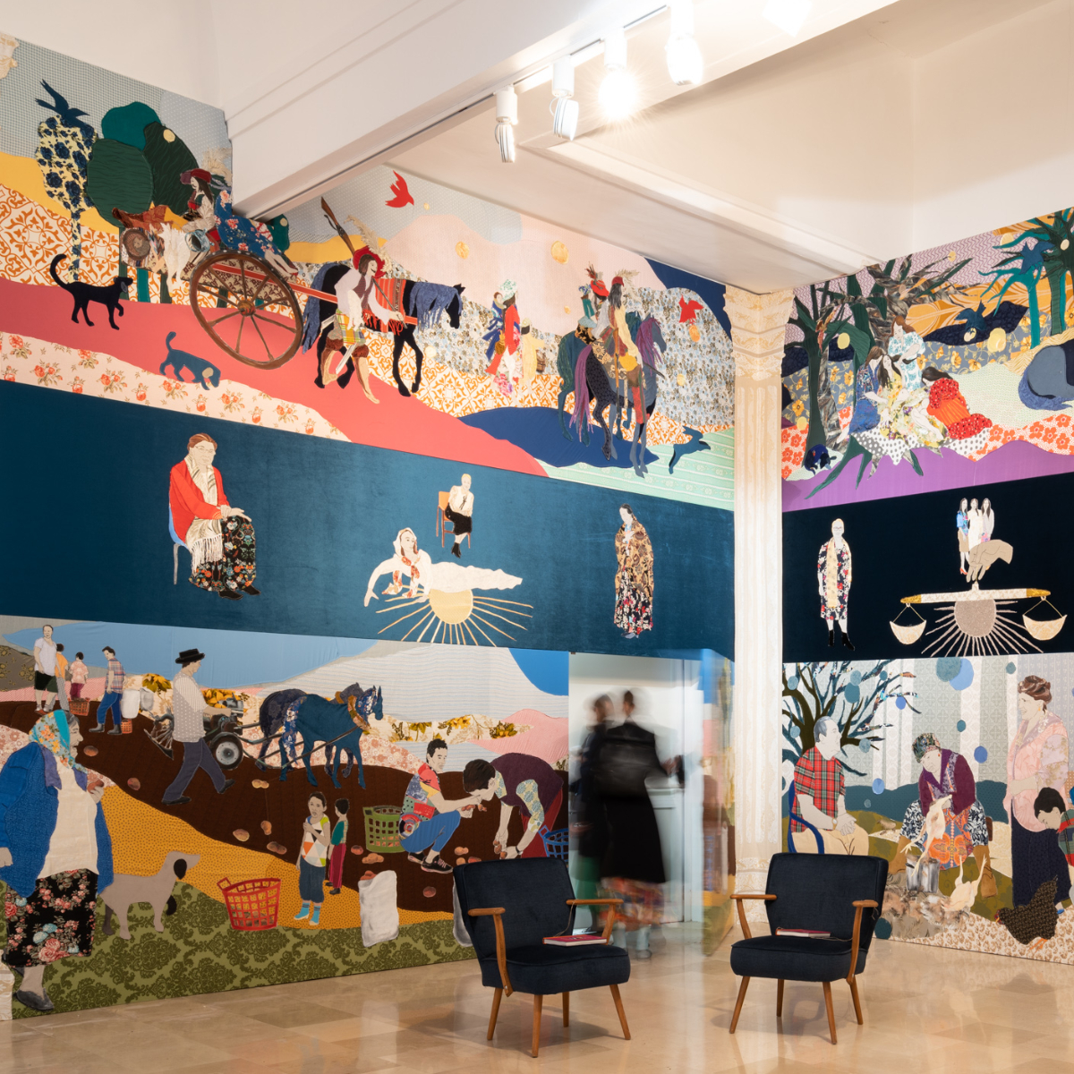 Bunt und beeindruckend: Der polnische Länder-Pavillion zeigt 2022 wandfüllende Collagen aus Textil und Malerei der Malerin Małgorzata Mirga-Tas. Inspiriert von den Fresken im Renaissance-Palazzo Schifanoia in Ferrara, stellt die Künstlerin unter dem Titel „Re-enchanting the World“ mythische Wanderungen der Roma durch Asien und Europa nach. Eine magische Welt, die Małgorzata Mirga-Tas hier erschaffen hat. Man könnte darin auch eine Art vorübergehende und zufällige Zuflucht sehen, ein Asyl, das Hoffnung und Erholung bietet.