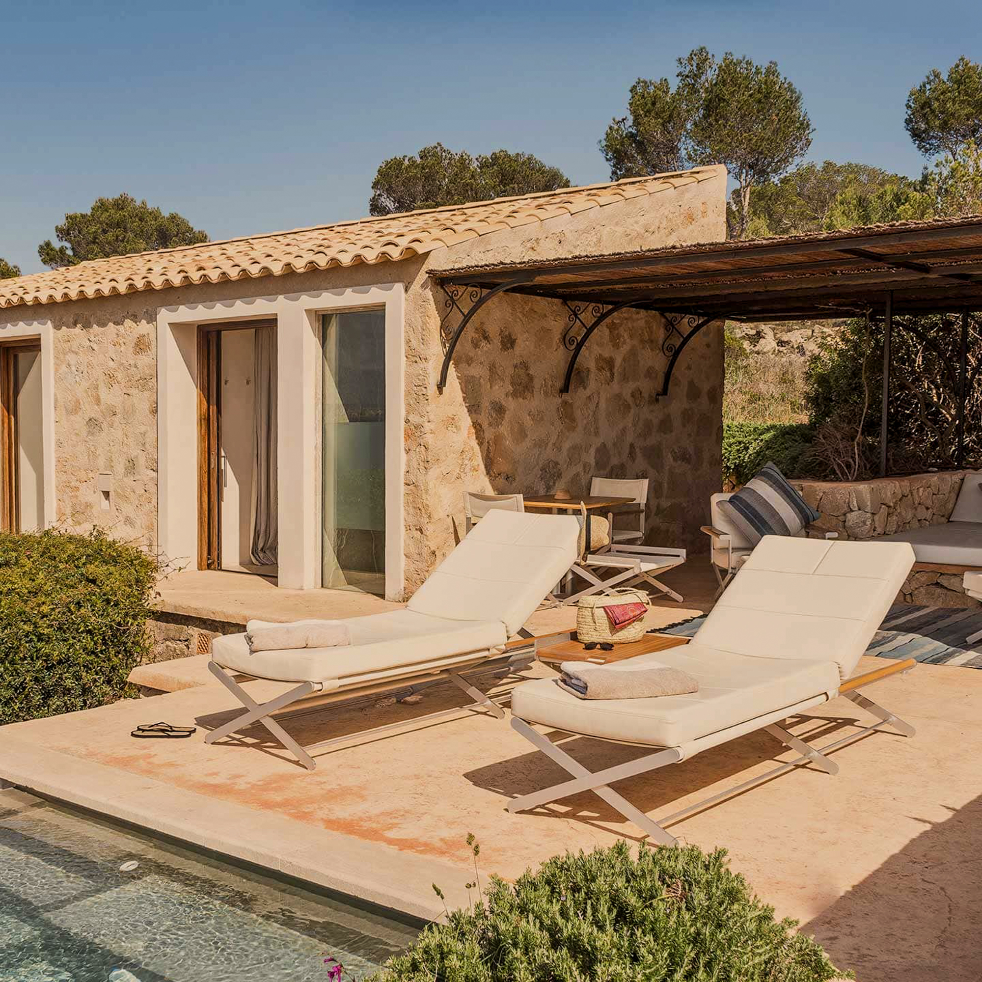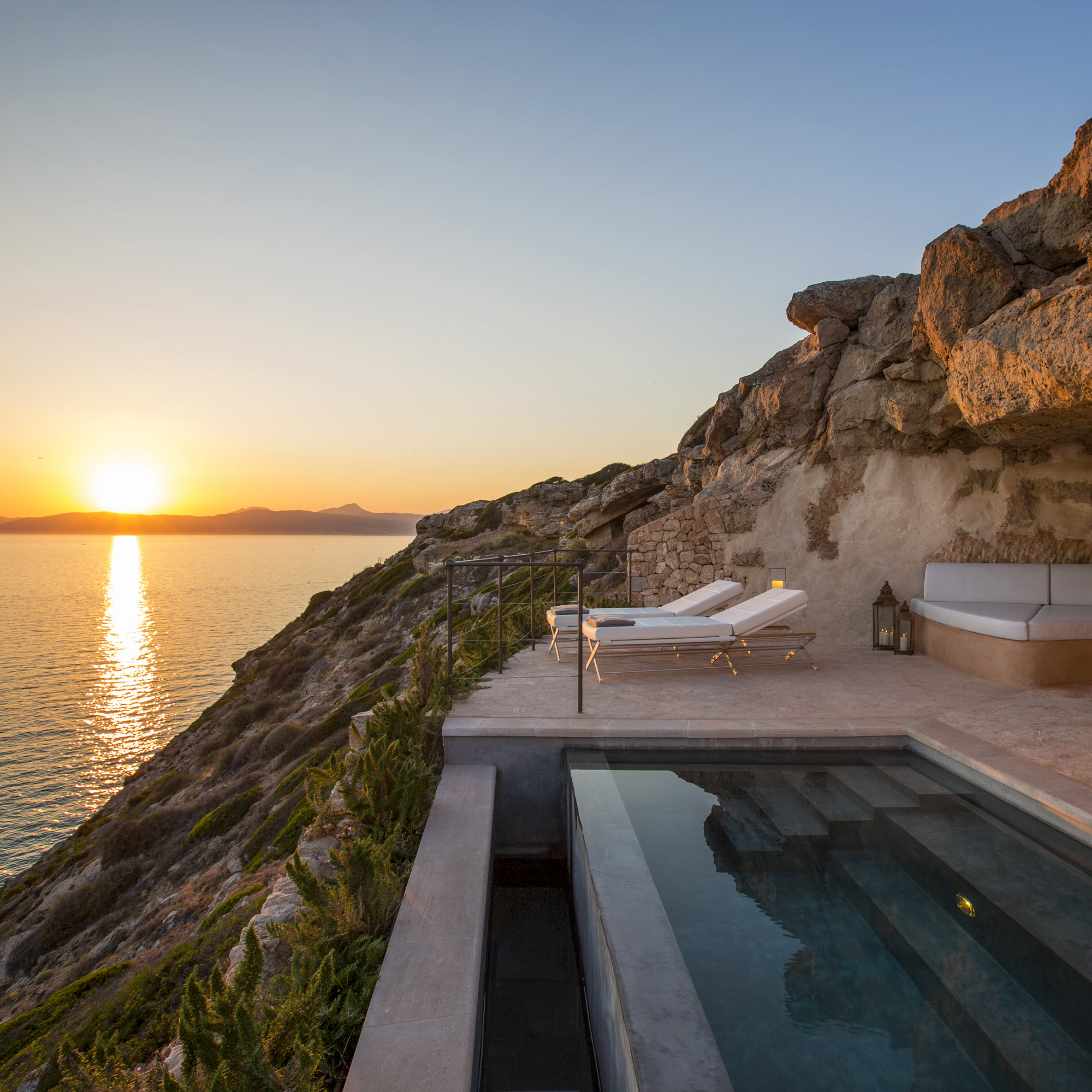 Auch der Zugang zum Wasser folgt der Logik der Diskretion. Kein klassischer Strand, kein Trubel. Stattdessen ein in die Felsen eingebetteter Badebereich, der ausschließlich den Gästen vorbehalten ist. Das Meer schimmert in intensiven Blautönen, die Luft riecht nach Salz und Pinien, und mit jedem Moment wird der Abstand zum Alltag größer.