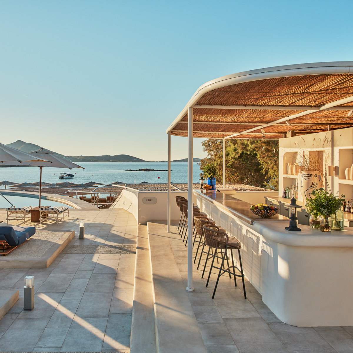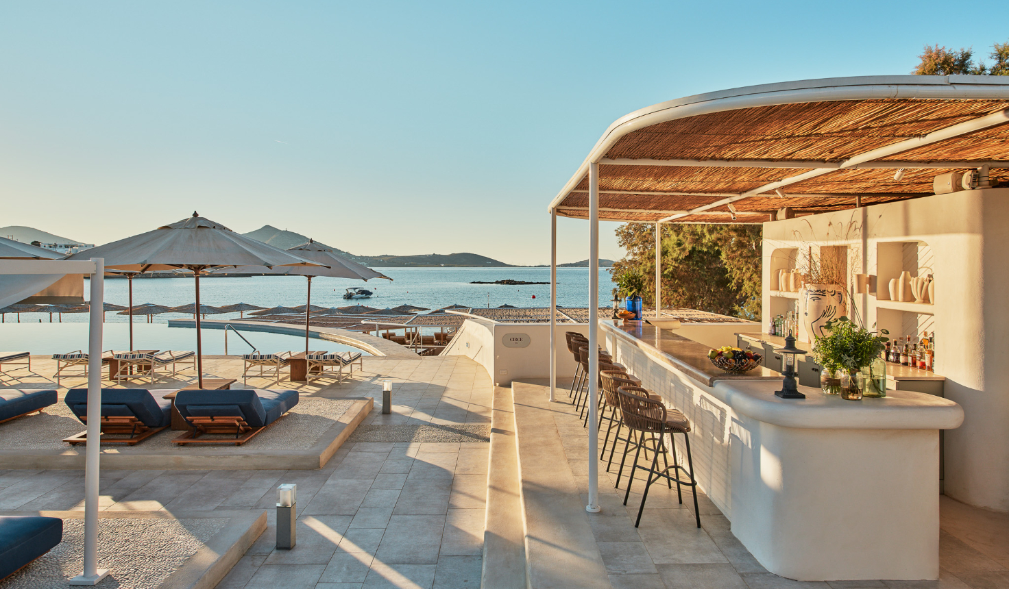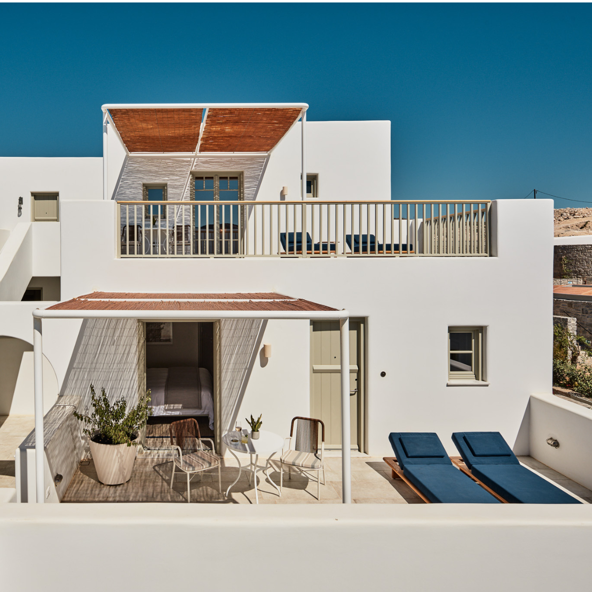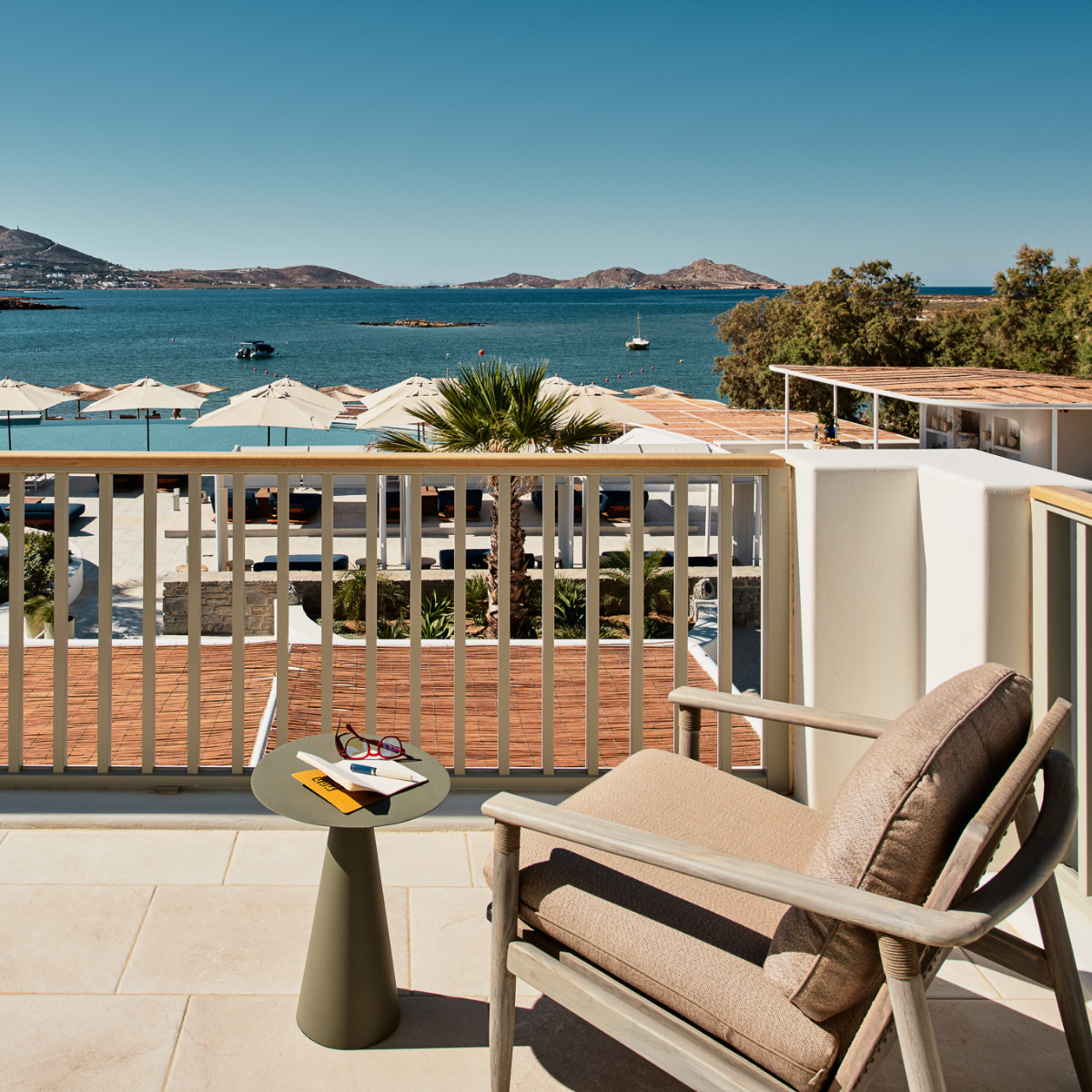 Errichtet im traditionellen wie zeitgemäßen Kyladen-Stil – helle, warme Farben und Blau als Akzentfarbe, präsentiert sich das zur „A Luxus Collection Resort“ gehörige Boutiquehotel wie ein kleines gemütliches Dorf. Direkt am Meer, mit atemberaubenden Ausblicken auf die türkise Ägais und unbewohnte, karge Inseln.