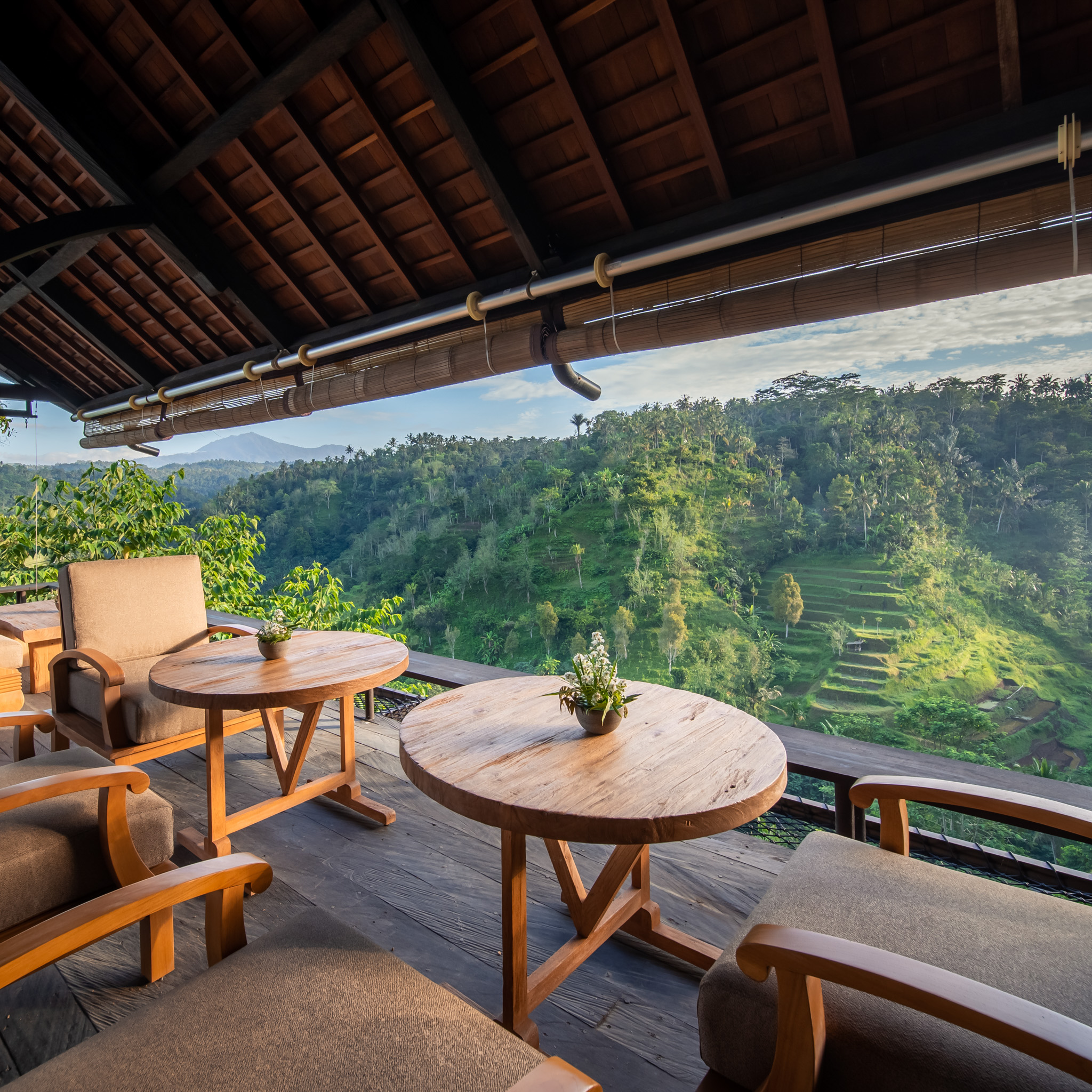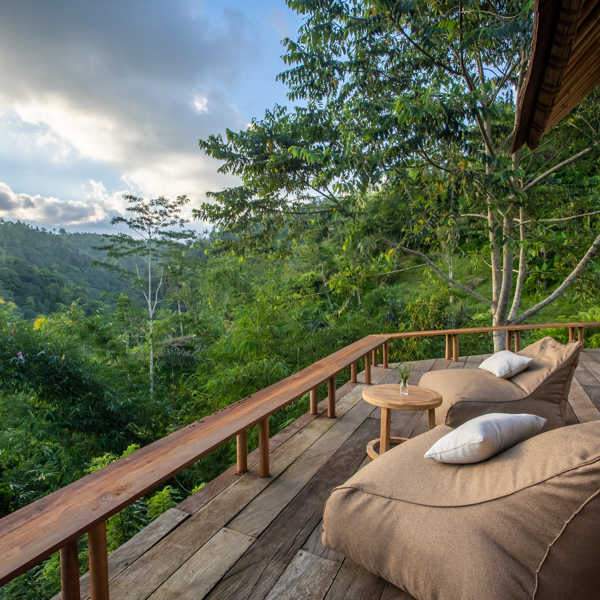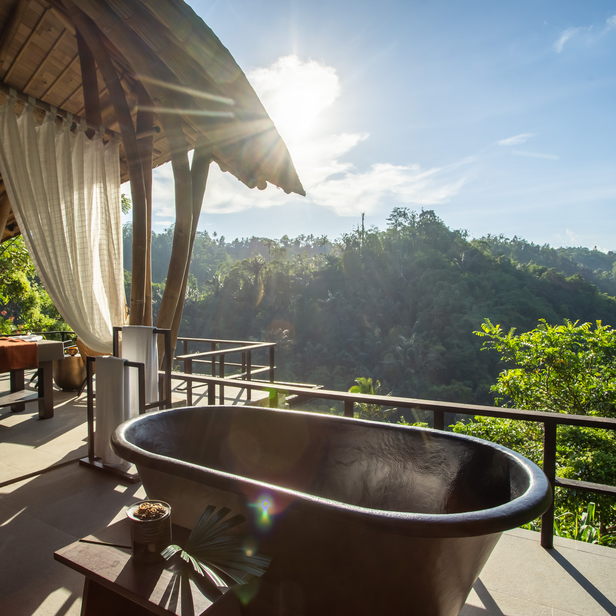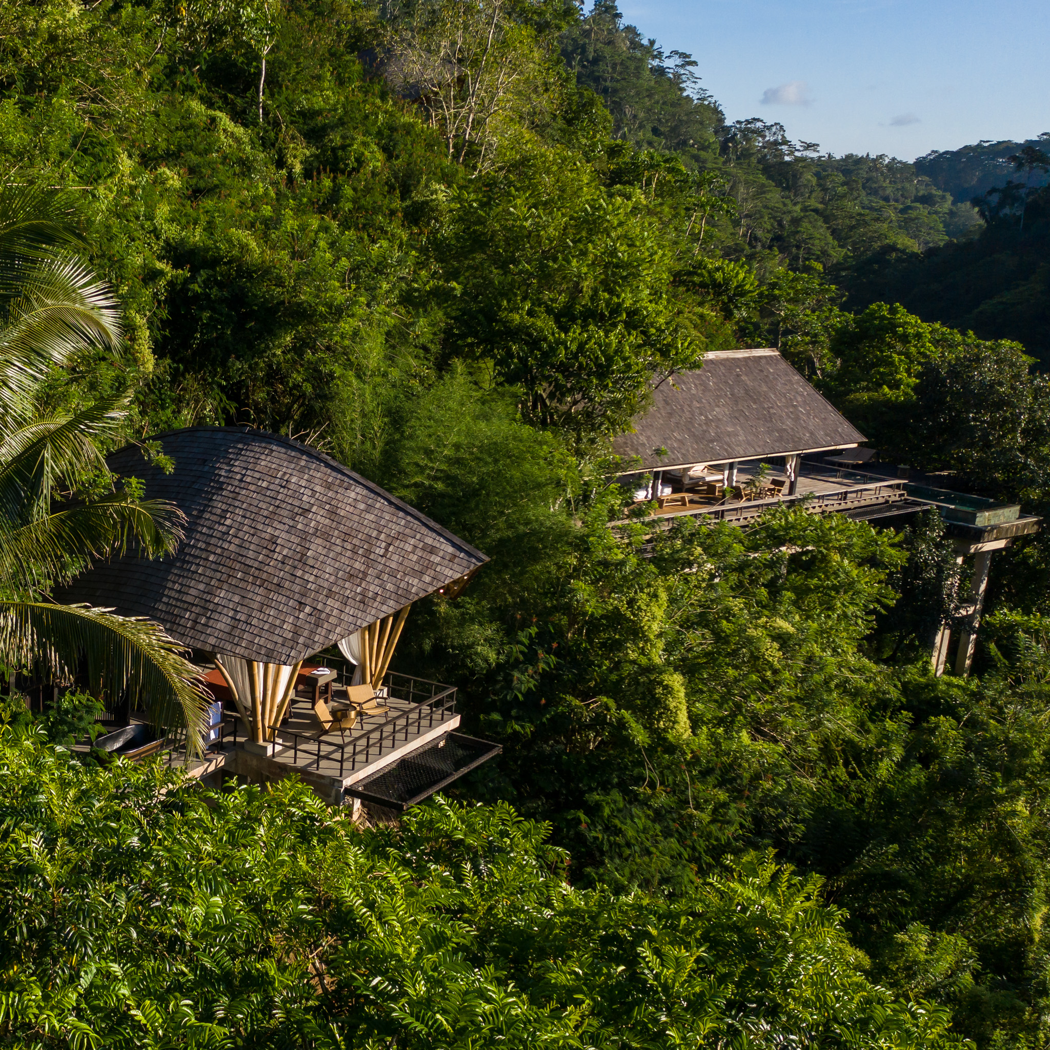 Quasi ein weitläufiger Raum auf 125 Quadratmetern, Ess-, Wohn- und Loungebereiche sind offen, der private Pool direkt an einer der Terrassen, der Ausblick 180 Grad in und über den Dschungel. Die Badewanne auf dem überdachten Holzdeck, schwer vorstellbar, dass sie anderswo in einem geschlossenen Badezimmer steht.